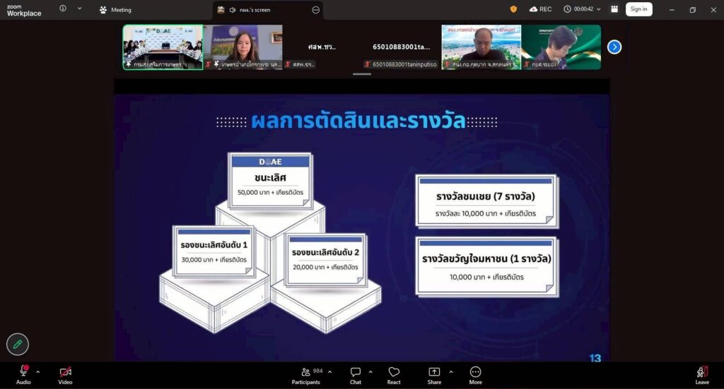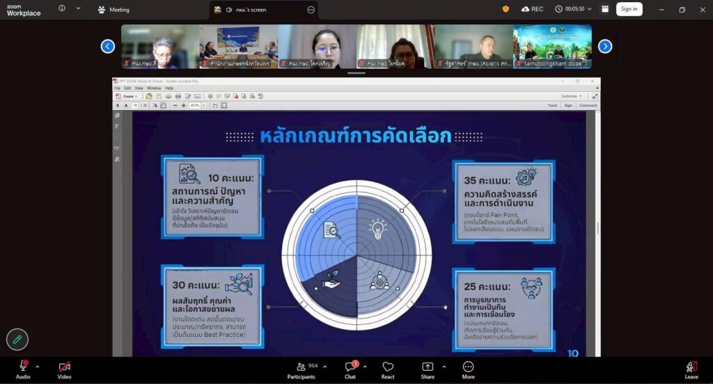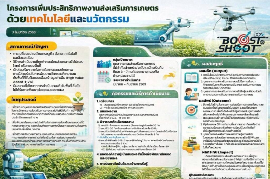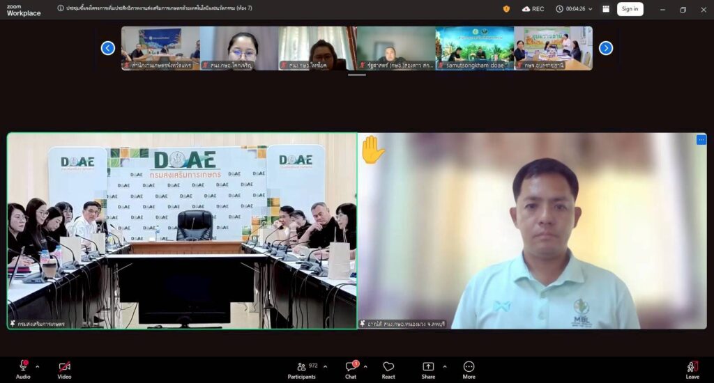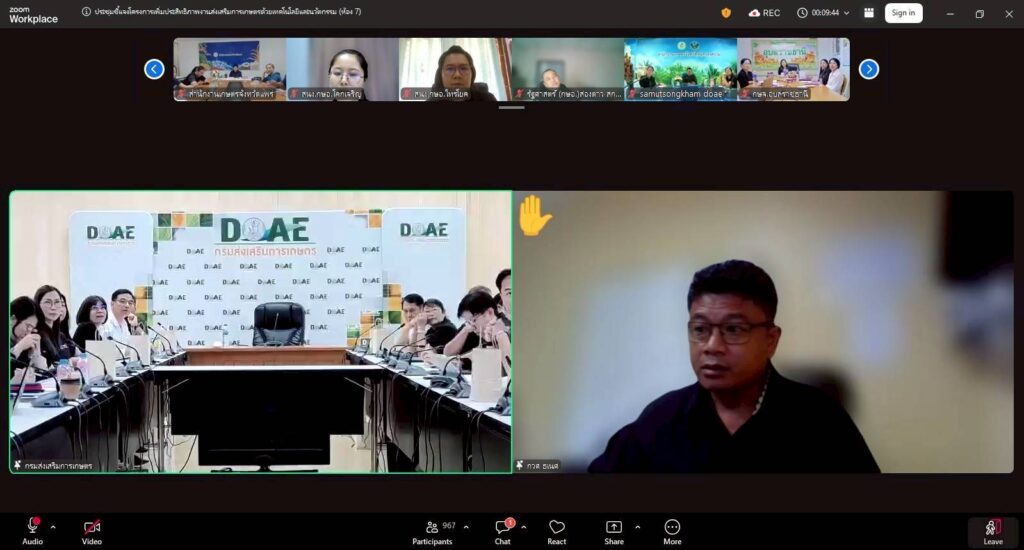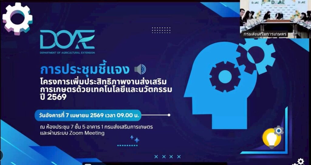 วันที่ 7 เมษายน 2569 เวลา 09.00 น. นางพรรณี สุขใส ผู้อำนวยการศูนย์ส่งเสริมและพัฒนาอาชีพการเกษตร จังหวัดเชียงราย เข้าร่วมประชุมชี้แจงโครงการเพิ่มประสิทธิภาพงานส่งเสริมการเกษตรด้วยเทคโนโลยีและนวัตกรรม DOAE Boost and Shoot. ผ่านระบบออนไลน์ Zoom Meeting. จากห้องประชุมกรมส่งเสริมการเกษตร ณ ศูนย์ส่งเสริมและพัฒนาอาชีพการเกษตร จังหวัดเชียงราย เพื่อรับทราบการชี้แจงเกี่ยวกับโครงการเพิ่มประสิทธิภาพงานส่งเสริมการเกษตรด้วยเทคโนโลยีและนวัตกรรม คําสั่งแต่งตั้งคณะกรรมการโครงการเพิ่มประสิทธิภาพงานส่งเสริมการเกษตร
