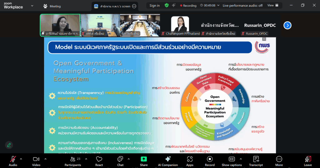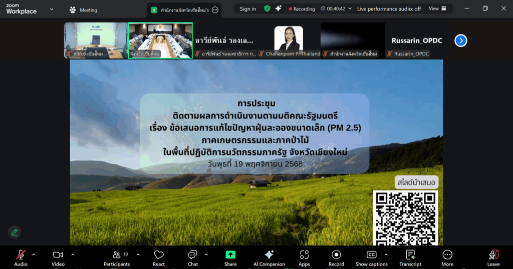 วันที่ 19 พฤศจิกายน 2568 นางสาววรวรรณ อังกสิทธิ์ รักษาการผู้อำนวยการสำนักงานส่งเสริมและพัฒนาการเกษตรเขตที่ 6 จังหวัดเชียงใหม่ พร้อมด้วยนายพัชญ์ธน วิกัน ผู้อำนวยการกลุ่มยุทธศาสตร์และสารสนเทศ และเจ้าหน้าที่ผู้เกี่ยวข้อง เข้าร่วมประชุมติดตามผลการดำเนินงานตามมติคณะรัฐมนตรี เรื่อง ข้อเสนอการแก้ไขปัญหาฝุ่นละอองขนาดเล็ก (PM 2.5) ภาคเกษตรกรรมและภาคป่าไม้ ในพื้นที่ปฏิบัติการนวัตกรรมภาครัฐ จังหวัดเชียงใหม่ ผ่านระบบออนไลน์ ณ ห้องประชุมสำนักงานส่งเสริมและพัฒนาการเกษตรที่ 6 จังหวัดเชียงใหม่ โดยมีนายรัฐพล นราดิศร ผู้ว่าราชการจังหวัดเชียงใหม่ เป็นประธานการประชุม