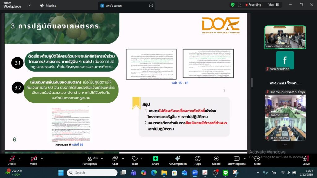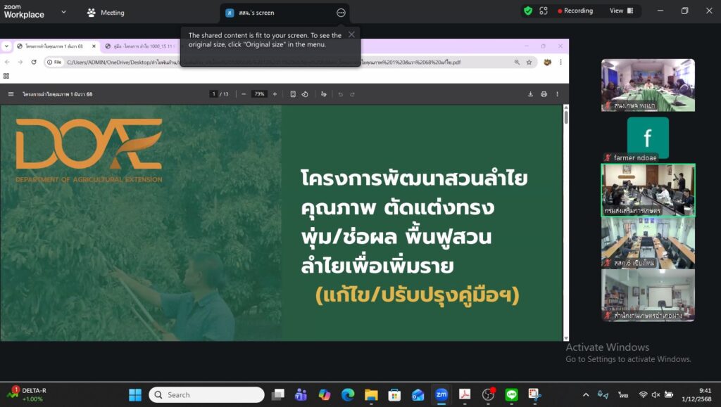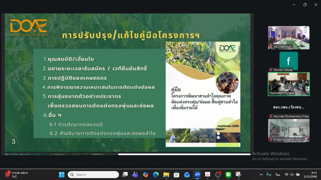 วันที่ 1 ธันวาคม 2568 นางสาวศิริลักษณ์ กมล ผู้อำนวยการกลุ่มส่งเสริมและพัฒนาการผลิต พร้อมด้วยผู้เกี่ยวข้อง เข้าร่วมการประชุมชี้แจง “โครงการพัฒนาคุณภาพสวนลำไยตัดแต่งทรงพุ่มช่อผล และฟื้นฟูสวนลำไยเพื่อเพิ่มรายได้” ผ่านระบบ Zoom Meeting โดยมีนายวีรศักดิ์ บุญเชิญ รองอธิบดีกรมส่งเสริมการเกษตร เป็นประธานการประชุม