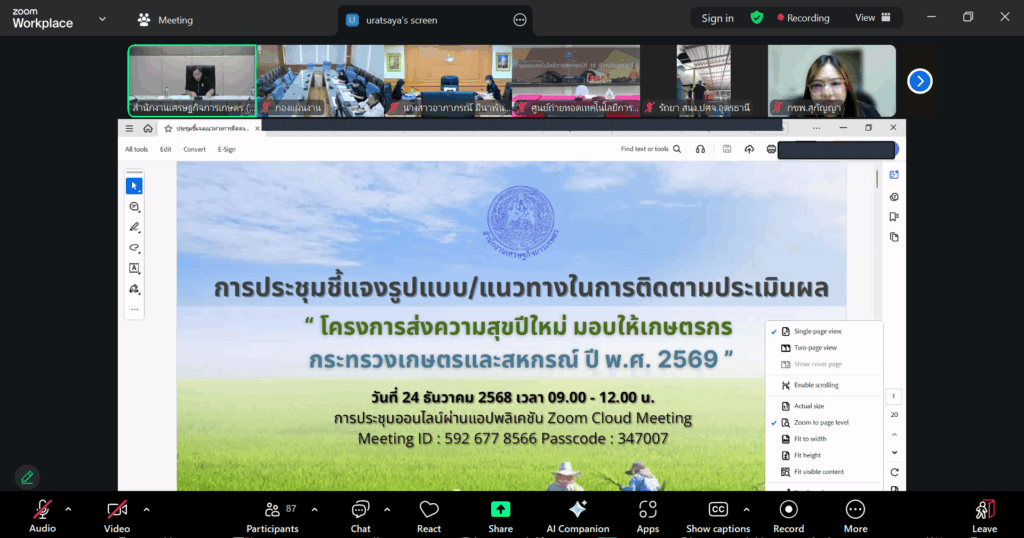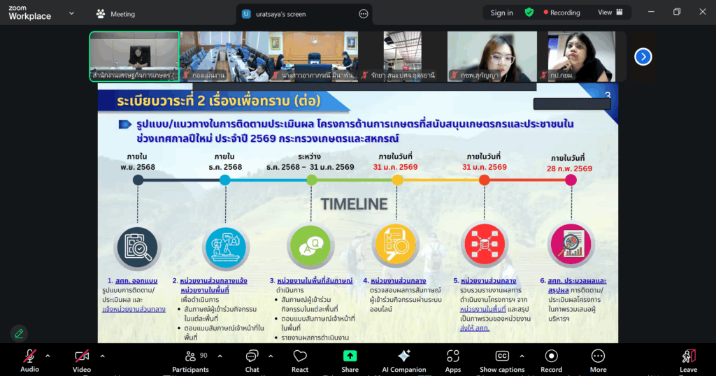 วันที่ 24 ธันวาคม 2568 นายพัชญ์ธน วิกัน ผู้อำนวยการกลุ่มยุทธศาสตร์และสารสนเทศ พร้อมด้วย นางสาวรุ่งอรุณ ทาวรรณะ นักวิชาการส่งเสริมการเกษตรชำนาญการ เข้าประชุมชี้แจงรูปแบบ/แนวทางในการติดตามประเมินโครงการส่งความสุขปีใหม่ มอบให้เกษตรกร กระทรวงเกษตรและสหกรณ์ ประจำปี พ.ศ. 2569 ผ่านระบบออนไลน์ ณ ห้องประชุมสำนักงานส่งเสริมและพัฒนาการเกษตรที่ 6 จังหวัดเชียงใหม่ โดยมี นางพนิดา โตพ่วง เศรษฐกรเชี่ยวชาญด้านประเมินผลการพัฒนาการเกษตร สำนักงานเศรษฐกิจการเกษตร เป็นประธานการประชุม และผู้แทนหน่วยงานในสังกัดกระทรวงเกษตรและสหกรณ์ เข้าร่วมการประชุม ในการจัดประชุมครั้งนี้มีวัตถุประสงค์เพื่อชี้แจงรูปแบบ/แนวทางในการติดตามประเมินโครงการส่งความสุขปีใหม่ มอบให้เกษตรกร กระทรวงเกษตรและสหกรณ์ ประจำปี พ.ศ. 2569 ที่ดำเนินการในช่วงเดือนธันวาคม 2568 – มกราคม 2569 และคาดหวังให้หน่วยงานเกิดความเข้าใจร่วมกันในการประเมินผลการจัดงานในครั้งนี้ ให้เป็นไปอย่างมีประสิทธิภาพต่อไป