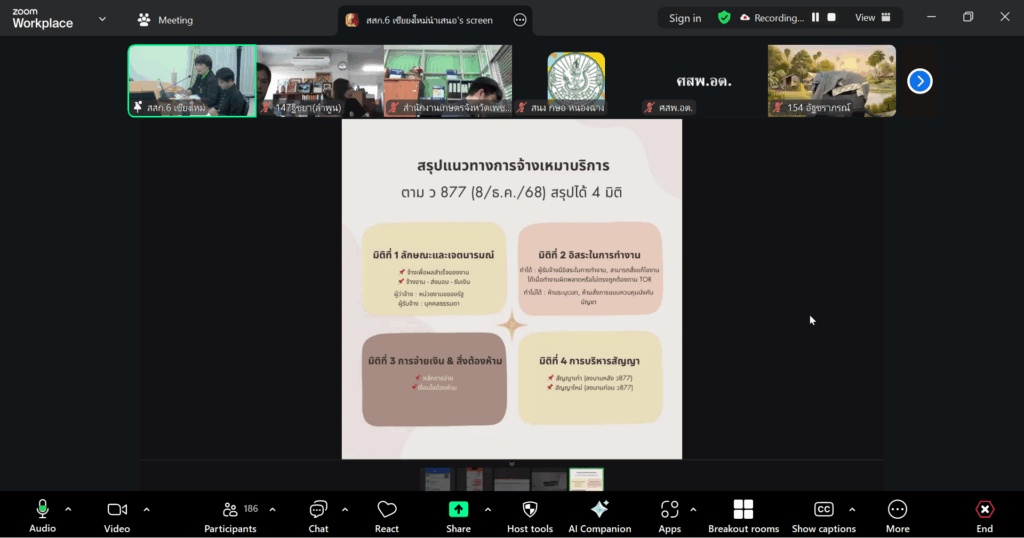 วันที่ 26 ธันวาคม 2568 ฝ่ายบริหารทั่วไป สำนักงานส่งเสริมและพัฒนาการเกษตรที่ 6 จังหวัดเชียงใหม่ จัดประชุมการกำหนดขอบเขตและรายละเอียดงานจ้างเหมาบริการ ประจำปีงบประมาณ 2569 ผ่านระบบออนไลน์ เพื่อให้หน่วยงานเข้าใจและปฏิบัติได้อย่างถูกต้อง เป็นไปในแนวทางเดียวกันอาศัยอำนาจตามมาตรา 29 วรรคหนึ่ง (3) แห่ง พระราชบัญญัติการจัดซื้อจัดจ้างและการบริหารภาครัฐ พ.ศ. 2560 ซ้อมความเข้าใจแนวทางปฏิบัติสำหรับการจ้างเหมาบริการ ตามมาตรา ๔ แห่งพระราชบัญญัติ และหลักเกณฑ์และวิธีการเสริมสร้างและพัฒนาให้ผู้อยู่ใต้บังคับบัญชามีวินัย และป้องกันมิให้ผู้อยู่ใต้บังคับบัญชากระทำผิดวินัย โดยมีนางสาววรวรรณ อังกสิทธิ์ รักษาการผู้อำนวยการสำนักงานส่งเสริมและพัฒนาการเกษตรเขตที่ 6 จังหวัดเชียงใหม่ เป็นประธานการประชุมฯ และมีผู้รับผิดชอบงานสำนักงานเกษตรจังหวัดทั้ง 17 จังหวัด สำนักงานเกษตรอำเภอ และศูนย์ปฏิบัติการ เข้าร่วมการประชุม