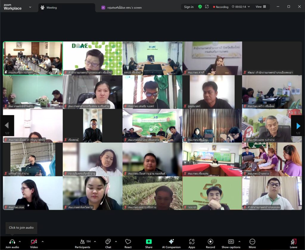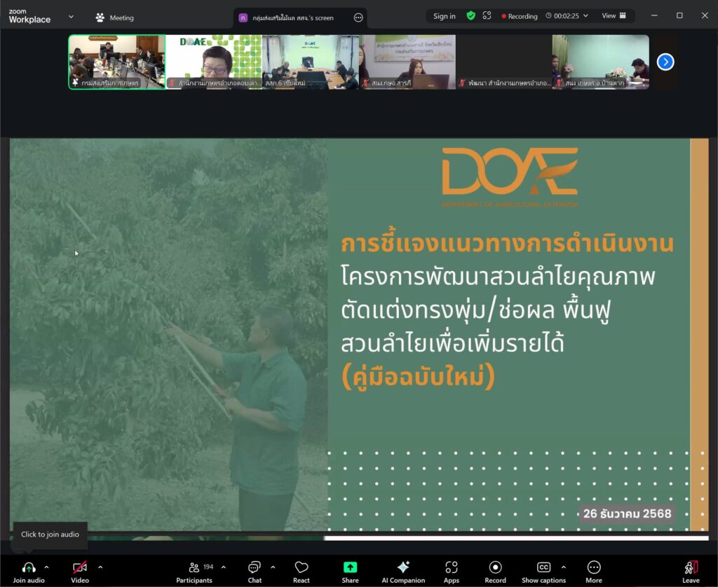 วันที่ 25 ธันวาคม 2568 นางสาวศิริลักษณ์ กมล ผู้อำนวยการกลุ่มส่งเสริมและพัฒนาการผลิต พร้อมด้วยผู้เกี่ยวข้อง เข้าร่วมการประชุมคณะกรรมการบริหารโครงการพัฒนาสวนลำไยคุณภาพตัดแต่งทรงพุ่ม/ช่อผล ฟื้นฟูสวนลำไย เพื่อเพิ่มรายได้ ครั้งที่ 8/2568 ผ่านระบบออนไลน์ ณ ห้องประชุมสำนักงานส่งเสริมและพัฒนาการเกษตรที่ 6 จังหวัดเชียงใหม่ โดยมี นายวีรศักดิ์ บุญเชิญ รองอธิบดีกรมส่งเสริมการเกษตร เป็นประธานการประชุม และมีสำนักงานเกษตรจังหวัด 8 จังหวัดภาคเหนือ เข้าร่วมการประชุมในครั้งนี้