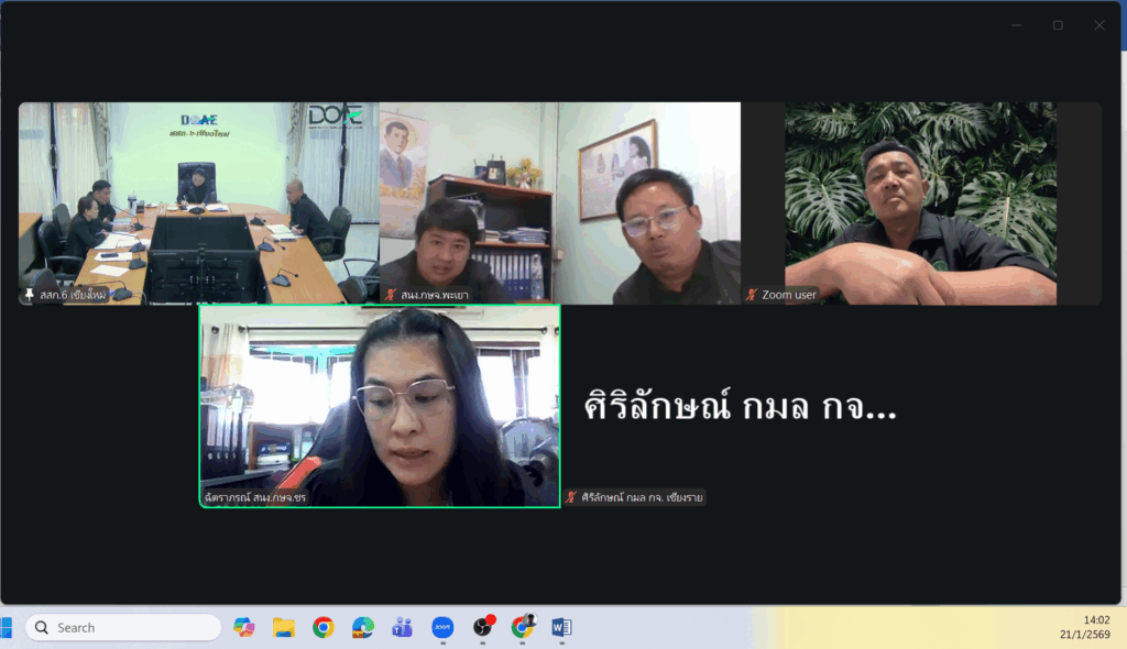 วันที่ 21 มกราคม 2569 นางสาวอัญชลี ปัญญากวาว ผู้อำนวยการสำนักงานส่งเสริมและพัฒนาการเกษตรที่ 6 จ.เชียงใหม่ เป็นประธานในการประชุมหารือแนวทางการส่งเสริมการปลูกกาแฟโรบัสต้า ครั้งที่ 1/2569 ผ่านระบบออนไลน์ ณ ห้องประชุมสำนักงานส่งเสริมและพัฒนาการเกษตรที่ 6 จังหวัดเชียงใหม่ โดยมีนายจาตุรนต์ สุวรรณพินท์ ปฏิบัติหน้าที่แทนผู้อำนวยการกลุ่มส่งเสริมและพัฒนาการผลิต และเจ้าหน้าที่ผู้รับผิดชอบงาน เป็นผู้ดำเนินการจัดประชุม ผู้เข้าร่วมประชุมประกอบด้วยสำนักงานเกษตรจังหวัดเชียงราย สำนักงานเกษตรจังหวัดพะเยา และสำนักงานเกษตรจังหวัดน่าน เข้าร่วมหารือ เพื่อเตรียมความพร้อมส่งเสริม และสนับสนุนการการปลูกกาแฟ ในภาคเหนือ