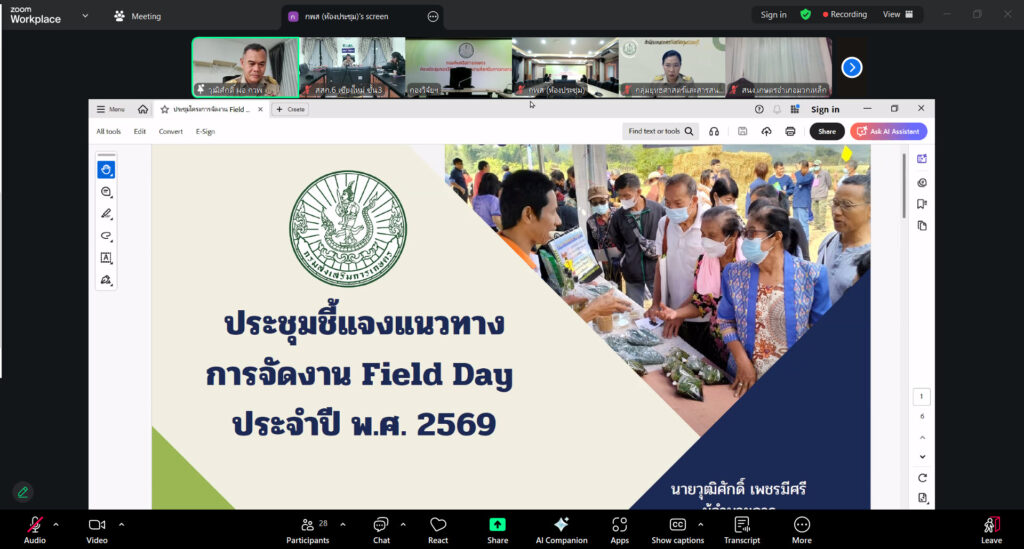 วันที่ 26 มกราคม 2569 นางสาวอัญชลี ปัญญากวาว ผู้อำนวยการสำนักงานส่งเสริมและพัฒนาการเกษตรที่ 6 จังหวัดเชียงใหม่ พร้อมด้วยนายพัชญ์ธน วิกัน ผู้อำนวยการกลุ่มยุทธศาสตร์และสารสนเทศ และเจ้าหน้าที่ผู้รับผิดชอบงาน เข้าร่วมประชุมเพื่อแจ้งแนวทางการจัดงานวันถ่ายทอดเทคโนโลยีเพื่อเริ่มต้นฤดูกาลผลิตใหม่ (Field Day) ประจำปี พ.ศ.2569 ผ่านระบบออนไลน์ ณ ห้องประชุมสำนักงานส่งเสริมและพัฒนาการเกษตรที่ 6 จังหวัดเชียงใหม่ โดยมี นายวุฒิศักดิ์ เพชรมีศรี ผู้อำนวยการกองวิจัยและพัฒนางานส่งเสริมการเกษตร กรมส่งเสริมการเกษตร เป็นประธานการประชุมฯ ผู้เข้าร่วมประชุมประกอบด้วยสำนักงานส่งเสริมและพัฒนาการเกษตรที่ 1-6 และสำนักงานเกษตรจังหวัดที่เกี่ยวข้อง เข้าร่วมประชุมฯ