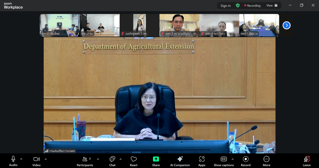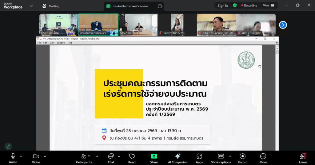 วันที่ 28 มกราคม 2569 นางสาวอัญชลี ปัญญากวาว ผู้อำนวยการสำนักงานส่งเสริมและพัฒนาการเกษตรที่ 6 จังหวัดเชียงใหม่ พร้อมด้วยนางสาวพนิดา ศรีพรม หัวหน้าฝ่ายบริหารทั่วไป และเจ้าหน้าที่ผู้รับผิดชอบงาน เข้าร่วมประชุมติดตามเร่งรัดการใช้จ่ายงบประมาณรายจ่ายประจำปี พ.ศ. 2569 ครั้งที่ 1/2569 ผ่านระบบออนไลน์ ณ ห้องประชุมสำนักงานส่งเสริมและพัฒนาการเกษตรที่ 6 จังหวัดเชียงใหม่ โดยมี นางอัญชลี สุวจิตตานนท์ อธิบดีกรมส่งเสริมการเกษตร เป็นประธานการประชุม เพื่อติดตามความก้าวหน้าผลการเบิกจ่ายงบประมาณและขับเคลื่อนโครงการตามภารกิจให้เป็นไปตามเป้าหมายที่กำหนด