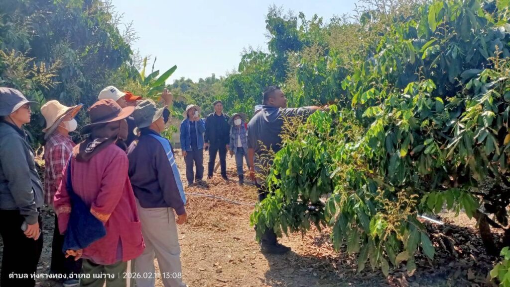 วันที่ 11 กุมภาพันธ์ 2569 นางสาวอัญชลี ปัญญากวาว ผู้อำนวยการสำนักงานส่งเสริมและพัฒนาการเกษตรเขตที่ 6 จังหวัดเชียงใหม่ มอบหมายให้นายจาตุรนต์ สุวรรณพินท์ นักวิชาการเกษตรชำนาญการพิเศษ ปฏิบัติหน้าที่แทนผู้อำนวยการกลุ่มส่งเสริมและพัฒนาการผลิต พร้อมด้วยคณะวิจัยโครงการวิจัยการพัฒนาศักยภาพจุดเรียนรู้ต้นแบบด้วยเทคโนโลยีการผลิตลำไยคุณภาพแบบสดช่อ ในพื้นที่ 6 จังหวัดภาคเหนือตอนบน ลงพื้นที่ติดตามแปลงเกษตรกรต้นแบบ และร่วมการจัดฝึกอบรมการเรียนรู้แบบมีส่วนร่วมและฝึกปฏิบัติ ครั้งที่ 2 ภายใต้โครงการวิจัยการพัฒนาศักยภาพจุดเรียนรู้ต้นแบบด้วยเทคโนโลยีการผลิตลำไยคุณภาพแบบสดช่อ ในพื้นที่ 6 จังหวัดภาคเหนือตอนบน ณ กลุ่มเกษตรกรแปลงใหญ่ลำไยบ้านสารภี อำเภอแม่วาง จังหวัดเชียงใหม่ โดยมีเจ้าหน้าที่จากสำนักงานเกษตรจังหวัดเชียงใหม่ สำนักงานเกษตรอำเภอแม่วาง ร่วมจัดเวทีด้วย ทั้งนี้ ได้มีการถ่ายทอดความรู้ด้านการตัดแต่งช่อผลเพื่อเพิ่มคุณภาพผลผลิต โดยนายธีรวัฒน์ บาลสุข นักวิชาการเกษตร ศูนย์วิจัยและพัฒนาลำไยแม่โจ้ สำนักวิจัยและส่งเสริมวิชาการการเกษตร มหาวิทยาลัยแม่โจ้