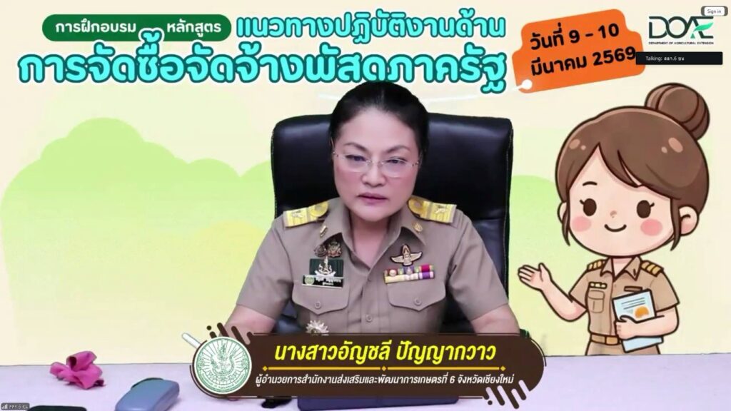 วันที่ 9 มีนาคม 2569 นางสาวอัญชลี ปัญญาวาว ผู้อำนวยการสำนักงานส่งเสริมและพัฒนาการเกษตรที่ 6 จังหวัดเชียงใหม่ เป็นประธานเปิดการฝึกอบรม “แนวทางการปฏิบัติงาน ด้านการจัดซื้อจัดจ้าง พัสดุภาครัฐ” ซึ่งการจัดการฝึกอบรมตามแผนพัฒนาบุคลากร แบบมีส่วนร่วม ประจำปีงบประมาณ 2569 ครั้งที่ 2 ผ่านระบบออนไลน์ ณ ห้องถ่ายทอดออนไลน์ ชั้น 2 สำนักงานส่งเสริมและพัฒนาการเกษตรที่ 6 จังหวัดเชียงใหม่