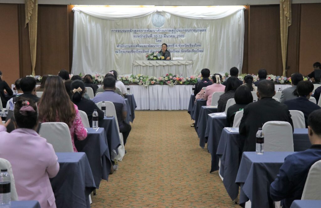 วันที่ 11 มีนาคม 2569 นางสาวอัญชลี ปัญญากวาว ผู้อำนวยการสำนักงานส่งเสริมและพัฒนาการเกษตรที่ 6 จังหวัดเชียงใหม่ เป็นประธานเปิดการอบรมหลักสูตรการพัฒนาศักยภาพสู่ผู้ประกอบการเกษตร ปี 2569 มีวัตถุประสงค์เพื่อส่งเสริมความรู้ ความเข้าใจ และทักษะที่จำเป็นในการประกอบธุรกิจเกษตร ทั้งด้านการบริหารจัดการห่วงโซ่อุปทาน การวางแผนการตลาด การพัฒนาผลิตภัณฑ์และบรรจุภัณฑ์ รวมถึงการประยุกต์ใช้เทคโนโลยีและนวัตกรรมเพื่อเพิ่มมูลค่าให้แก่ผลผลิตและสร้างรายได้อย่างมั่นคง ระหว่างวันที่ 10 – 13 มีนาคม 2569 โดยมีหัวข้อการอบรม ดังนี้