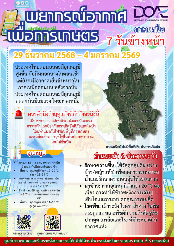 ข่าว Infoศปภ. ภาคเหนือ แจ้งเตือน “สภาพอากาศเพื่อการเกษตรภาคเหนือ 7 วันข้างหน้า” ระหว่างวันที่ 29 ธันวาคม 2568 – 4 มกราคม 2569 admin_doae / 29 ธันวาคม 2025