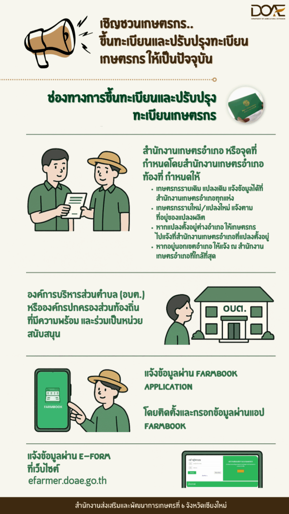ข่าว Infoเกษตรเขต 6 เชิญชวนเกษตรกร ขึ้นทะเบียนและปรับปรุงทะเบียนเกษตรกร ให้เป็นปัจจุบัน admin_doae / 23 ธันวาคม 2025
