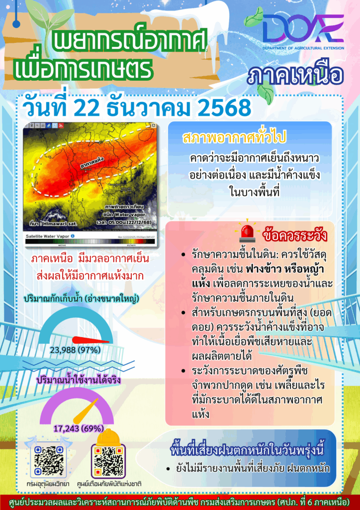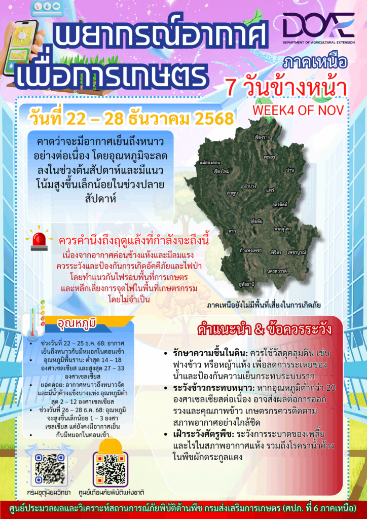 ข่าว Infoศปภ. ภาคเหนือ แจ้งเตือน “สภาพอากาศเพื่อการเกษตรภาคเหนือ 7 วันข้างหน้า” ระหว่างวันที่ 22-28 ธันวาคม 2568 admin_doae / 22 ธันวาคม 2025