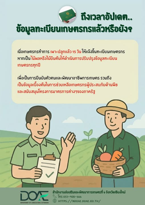 ข่าว Infoเกษตรกรโปรดตรวจสอบและปรับปรุงทะเบียนของท่านให้เป็นปัจจุบัน เพื่อให้ข้อมูลถูกต้องและสามารถเข้าถึงโครงการสนับสนุนต่าง ๆ ได้อย่างต่อเนื่องค่ะ admin_doae / 4 ธันวาคม 2025
