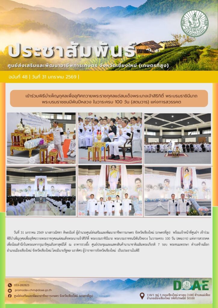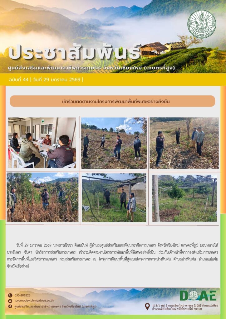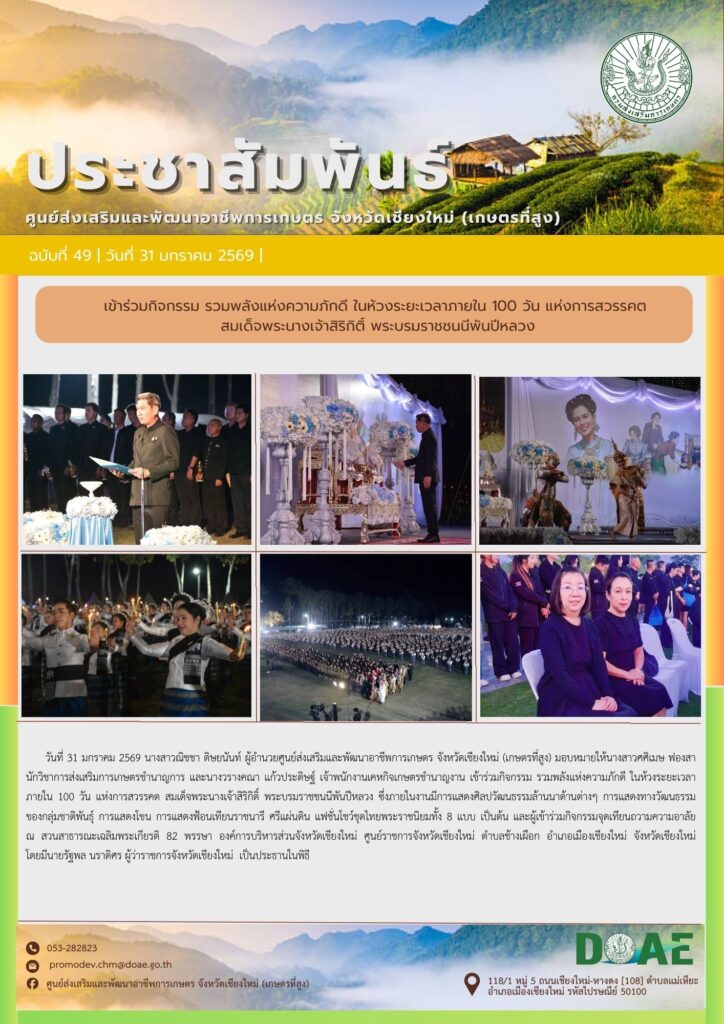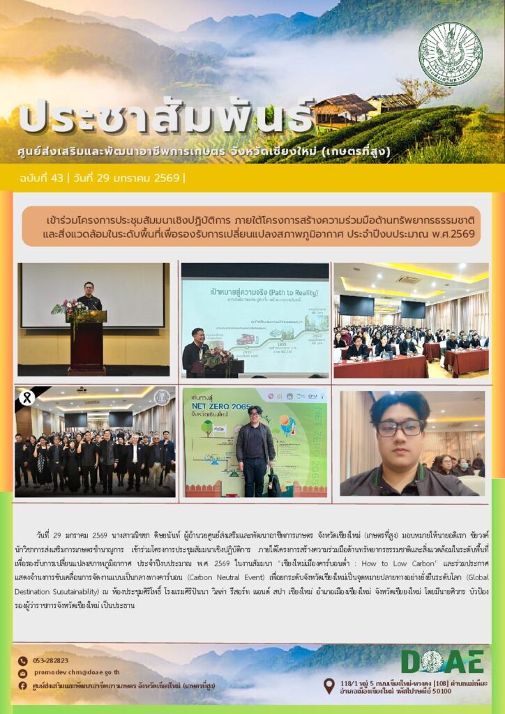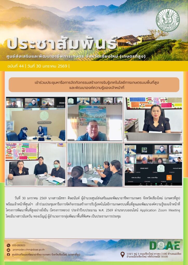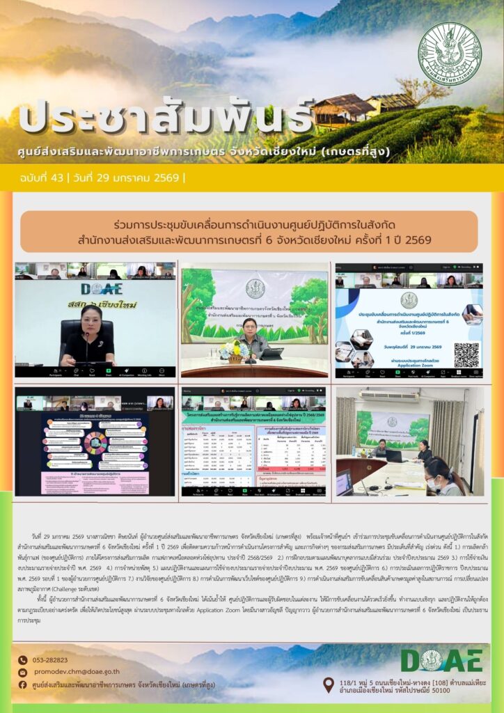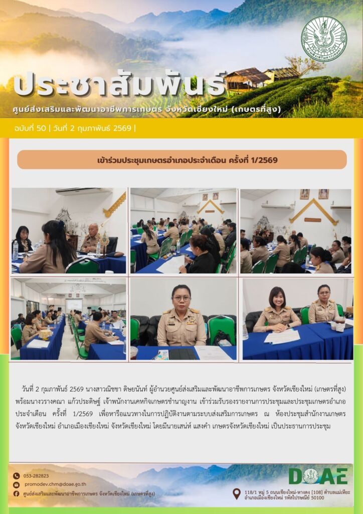 ข่าวประชาสัมพันธ์ร่วมการประชุมขับเคลื่อนการดำเนินงานศูนย์ปฏิบัติการในสังกัดสำนักงานส่งเสริมและพัฒนาการเกษตรที่ 6 จังหวัดเชียงใหม่ ครั้งที่ 1 ปี 2569 haec03 / 29 มกราคม 2026