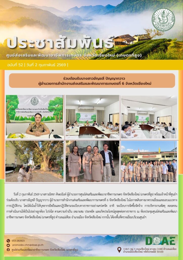 ข่าวประชาสัมพันธ์ร่วมต้อนรับนางสาวอัญชลี ปัญญากวาว ผู้อำนวยการสำนักงานส่งเสริมและพัฒนาการเกษตรที่ 6 จังหวัดเชียงใหม่ haec03 / 2 กุมภาพันธ์ 2026