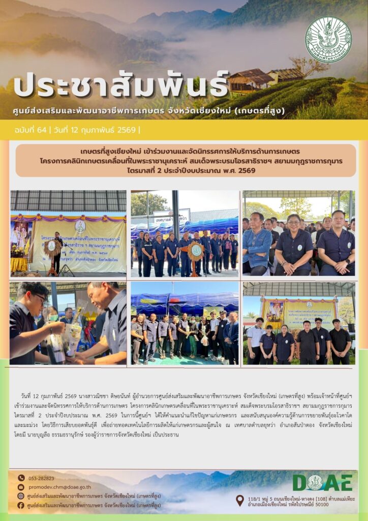 ข่าวประชาสัมพันธ์เกษตรที่สูงเชียงใหม่ เข้าร่วมงานและจัดนิทรรศการให้บริการด้านการเกษตรโครงการคลินิกเกษตรเคลื่อนที่ในพระราชานุเคราะห์ สมเด็จพระบรมโอรสาธิราชฯ สยามมกุฎราชการกุมาร ไตรมาสที่ 2 ประจำปีงบประมาณ พ.ศ. 2569 haec03 / 12 กุมภาพันธ์ 2026