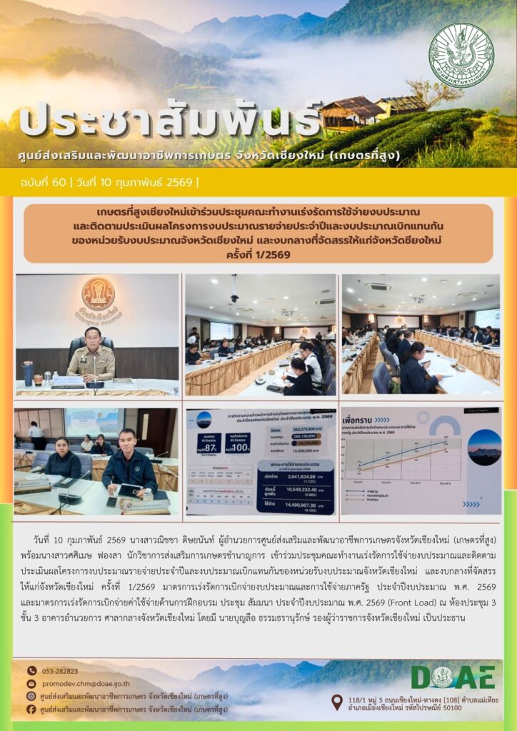 ข่าวประชาสัมพันธ์เกษตรที่สูงเชียงใหม่เข้าร่วมประชุมคณะทำงานเร่งรัดการใช้จ่ายงบประมาณและติดตามประเมินผลโครงการงบประมาณรายจ่ายประจำปีและงบประมาณเบิกแทนกันของหน่วยรับงบประมาณจังหวัดเชียงใหม่ และงบกลางที่จัดสรรให้แก่จังหวัดชียงใหม่ ครั้งที่ 1/2569 haec03 / 10 กุมภาพันธ์ 2026