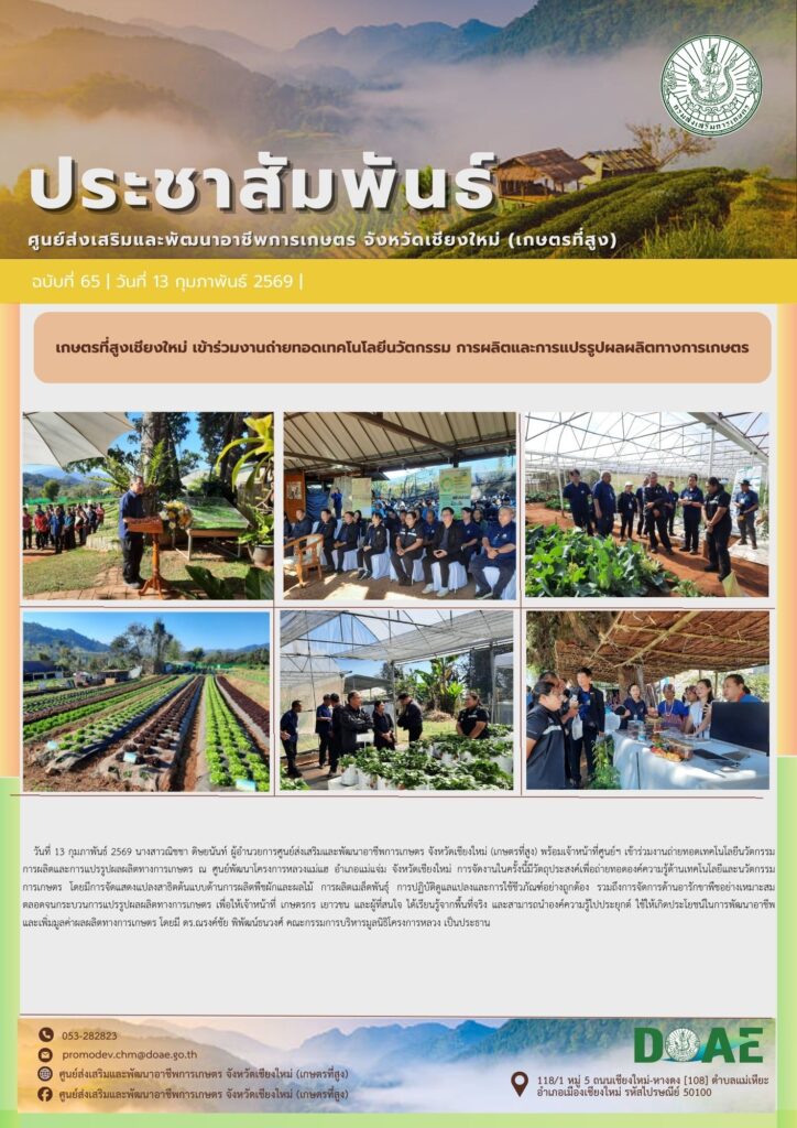 ข่าวประชาสัมพันธ์เกษตรที่สูงเชียงใหม่ เข้าร่วมงานถ่ายทอดเทคโนโลยีนวัตกรรม การผลิตและการแปรรูปผลผลิตทางการเกษตร haec03 / 13 กุมภาพันธ์ 2026