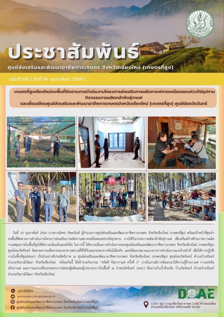 ข่าวประชาสัมพันธ์เกษตรที่สูงเชียงใหม่ลงพื้นที่ติดตามการดำเนินงานโครงการส่งเสริมการผลิตกาแฟภาคเหนือตลอดห่วงโซ่อุปทาน กิจกรรมการผลิตกล้าพันธุ์กาแฟและเยี่ยมเยียนศูนย์ส่งเสริมและพัฒนาอาชีพการเกษตรจังหวัดเชียงใหม่ (เกษตรที่สูง) ศูนย์ย่อยวัดจันทร์ haec03 / 14 กุมภาพันธ์ 2026