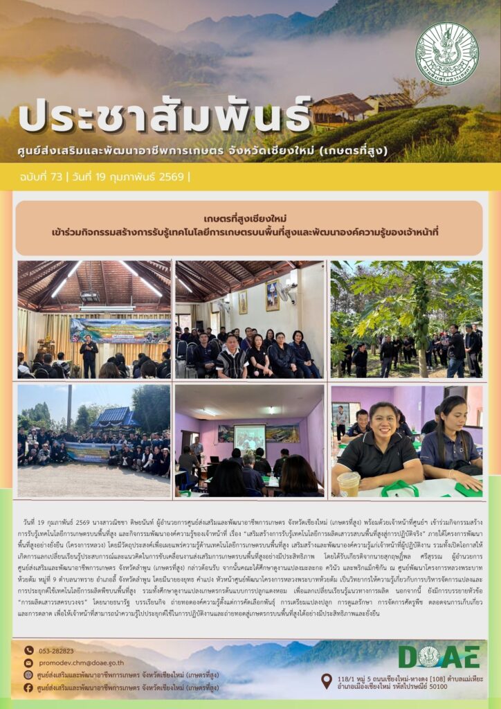 ข่าวประชาสัมพันธ์เกษตรที่สูงเชียงใหม่เข้าร่วมกิจกรรมสร้างการรับรู้เทคโนโลยีการเกษตรบนพื้นที่สูงและพัฒนาองค์ความรู้ของเจ้าหน้าที่ haec03 / 19 กุมภาพันธ์ 2026
