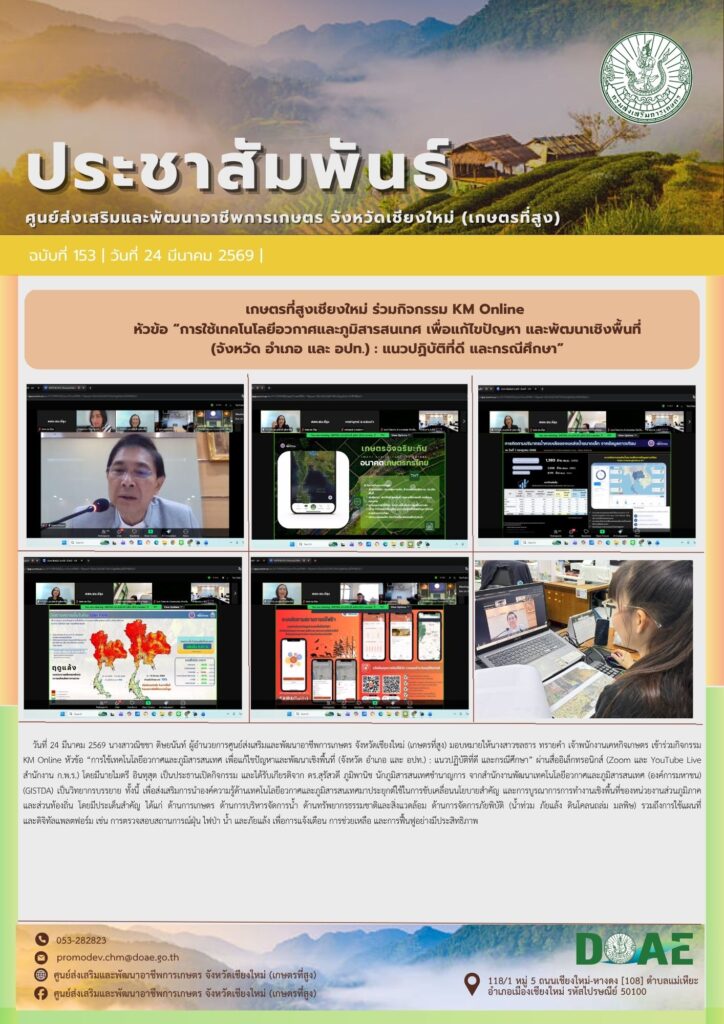 ข่าวประชาสัมพันธ์เกษตรที่สูงเชียงใหม่ ร่วมกิจกรรม KM Online หัวข้อ “การใช้เทคโนโลยีอวกาศและภูมิสารสนเทศ เพื่อแก้ไขปัญหา และพัฒนาเชิงพื้นที่ (จังหวัด อำเภอ และ อปท.) : แนวปฏิบัติที่ดี และกรณีศึกษา” haec03 / 25 มีนาคม 2026