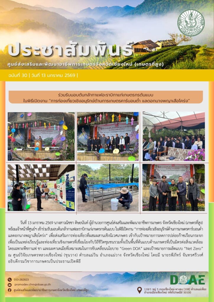 ข่าวประชาสัมพันธ์ร่วมรับมอบต้นกล้ากาแฟอะราบิกาแก่เกษตรกรต้นแบบ ในพิธีเปิดงาน “การท่องเที่ยวเชิงอนุรักษ์ด้านการเกษตรคาร์บอนต่ำ แลดอกนางพญาเสือโคร่ง” haec03 / 13 มกราคม 2026