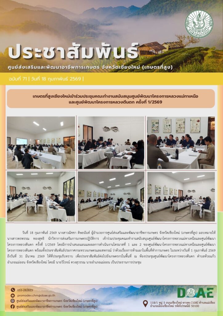 ข่าวประชาสัมพันธ์เกษตรที่สูงเชียงใหม่เข้าร่วมประชุมคณะทำงานสนับสนุนศูนย์พัฒนาโครงการหลวงแม่ทาเหนือและศูนย์พัฒนาโครงการหลวงตีนตก ครั้งที่ 1/2569 haec03 / 18 กุมภาพันธ์ 2026