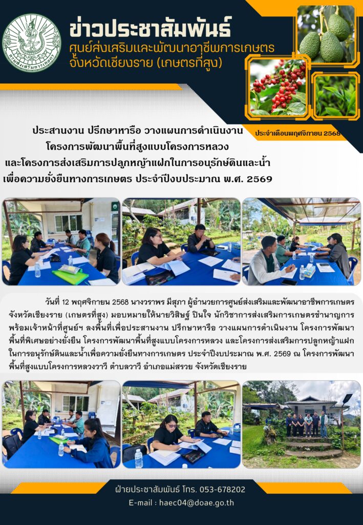 ประสานงาน วางแผนการดำเนินงาน โครงการพัฒนาพื้นที่สูงแบบโครงการหลวง และโครงการส่งเสริมการปลูกหญ้าแฝกในการอนุรักษ์ดินและน้ำเพื่อความยั่งยืนทางการเกษตรBy haec04 / 19 พฤศจิกายน 2025