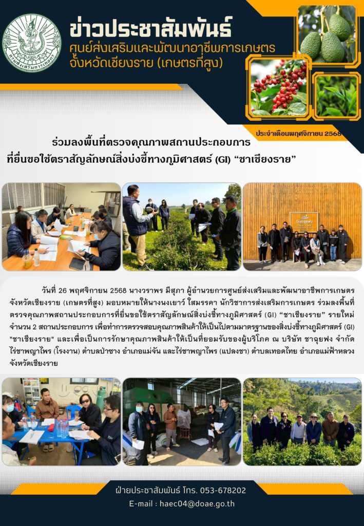 ร่วมลงพื้นที่ตรวจคุณภาพสถานประกอบการที่ยื่นขอใช้ตราสัญลักษณ์สิ่งบ่งชี้ทางภูมิศาสตร์ (GI) “ชาเชียงราย” รายใหม่
