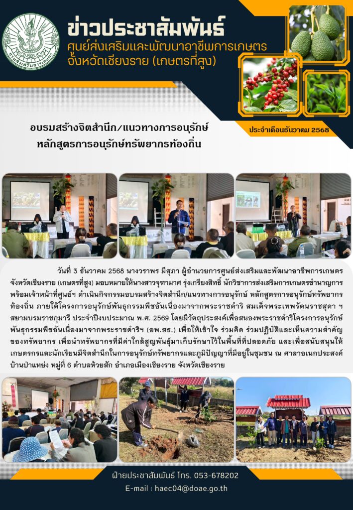 ดำเนินกิจกรรมอบรมสร้างจิตสำนึก/แนวทางการอนุรักษ์ หลักสูตรการอนุรักษ์ทรัพยากรท้องถิ่น ภายใต้โครงการอนุรักษ์พันธุกรรมพืชอันเนื่องมาจากพระราชดำริ สมเด็จพระเทพรัตนราชสุดา ฯ สยามบรมราชกุมารี ประจำปีงบประมาณ พ.ศ. 2569By haec04 / 23 ธันวาคม 2025