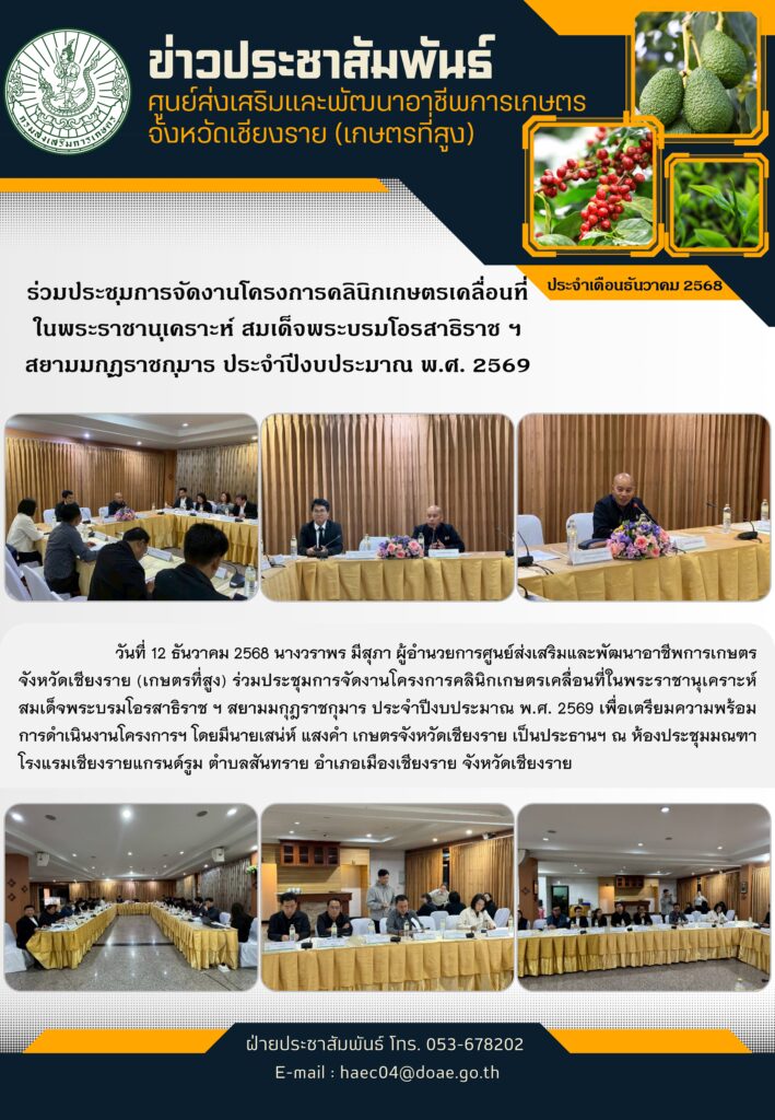 ร่วมประชุมการจัดงานโครงการคลินิกเกษตรเคลื่อนที่ในพระราชานุเคราะห์ สมเด็จพระบรมโอรสาธิราช ฯ สยามมกุฎราชกุมาร ประจำปีงบประมาณ พ.ศ. 2569By haec04 / 29 ธันวาคม 2025