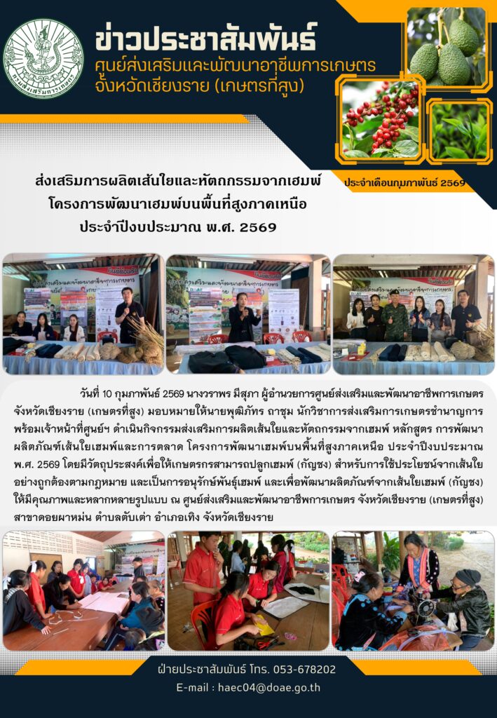 ดำเนินกิจกรรมส่งเสริมการผลิตเส้นใยและหัตถกรรมจากเฮมพ์ โครงการพัฒนาเฮมพ์บนพื้นที่สูงภาคเหนือ ประจำปีงบประมาณ พ.ศ. 2569By haec04 / 12 กุมภาพันธ์ 2026