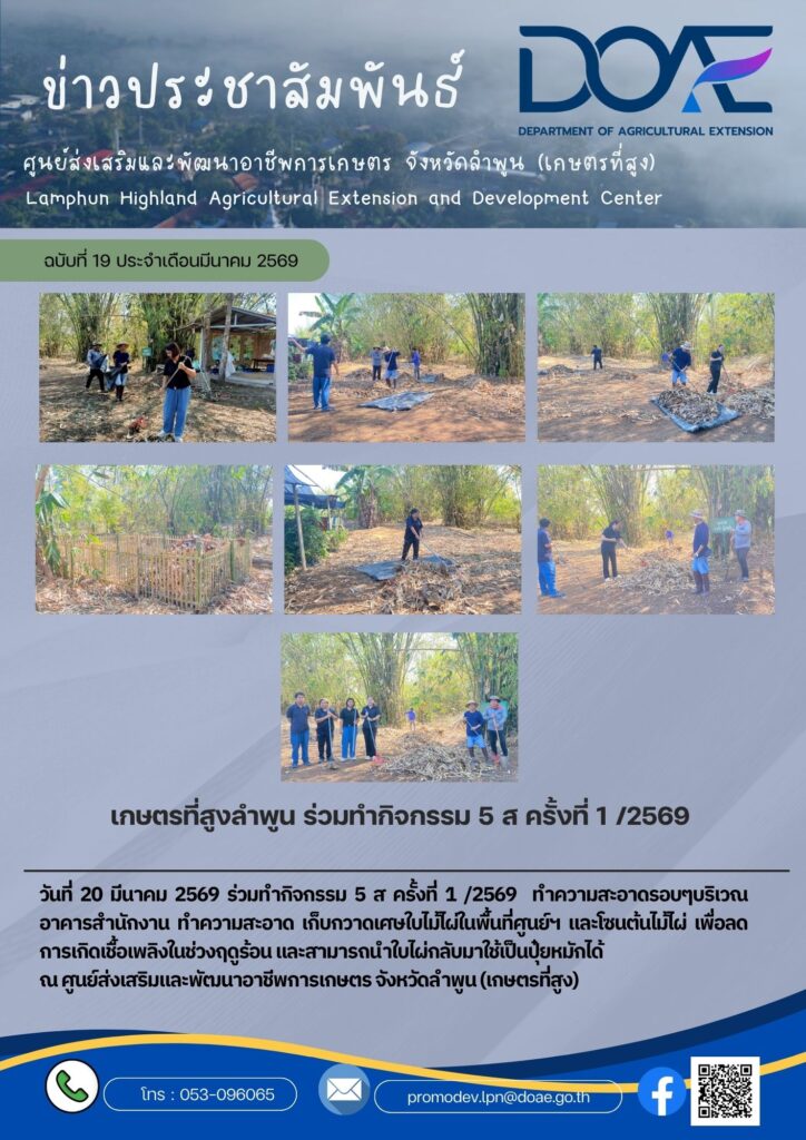 ข่าวประชาสัมพันธ์เกษตรที่สูงลำพูน ร่วมทำกิจกรรม 5 ส ครั้งที่ 1 /2569 haec05 / 24 มีนาคม 2026 วันที่ 20 มีนาคม 256