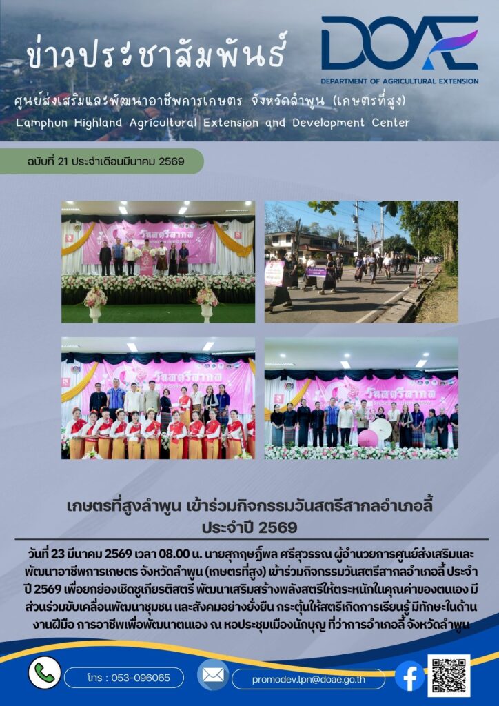 ข่าวประชาสัมพันธ์เกษตรที่สูงลำพูน เข้าร่วมกิจกรรมวันสตรีสากลอำเภอลี้ ประจำปี 2569 haec05 / 24 มีนาคม 2026 วันที่ 23 มีนาคม 256