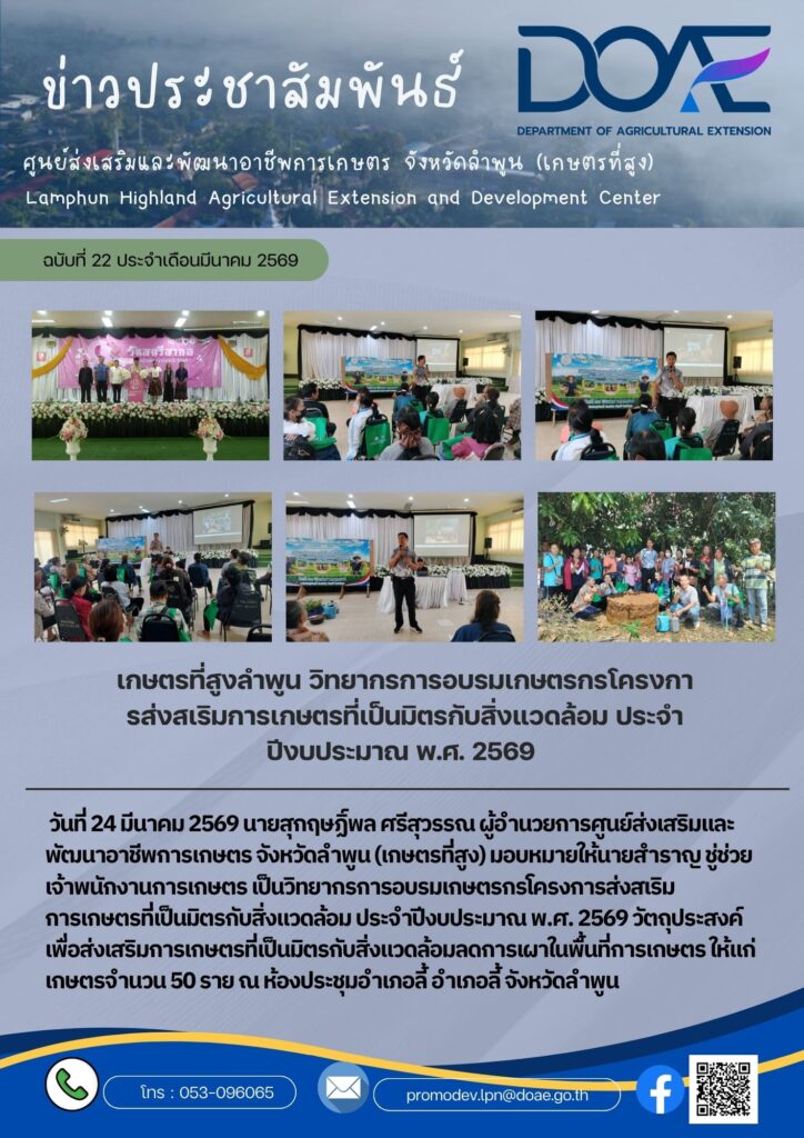 ข่าวประชาสัมพันธ์เกษตรที่สูงลำพูน วิทยากรการอบรมเกษตรกรโครงการส่งเสริมการเกษตรที่เป็นมิตรกับสิ่งแวดล้อม ประจำปีงบประมาณ พ.ศ. 2569 haec05 / 24 มีนาคม 2026 วันที่ 24 มีนาคม 256