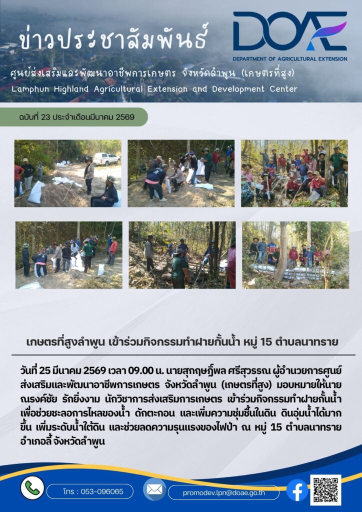 ข่าวประชาสัมพันธ์เกษตรที่สูงลำพูน เข้าร่วมกิจกรรมทำฝายกั้นน้ำ หมู่ 15 ตำบลนาทราย อำเภอลี้ จังหวัดลำพูน haec05 / 25 มีนาคม 2026 วันที่ 25 มีนาคม 256