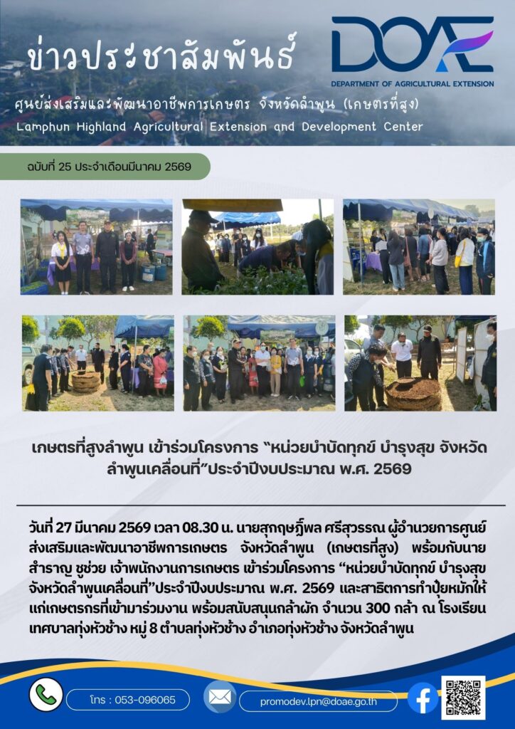 ข่าวประชาสัมพันธ์เกษตรที่สูงลำพูน เข้าร่วมโครงการ “หน่วยบำบัดทุกข์ บำรุงสุข จังหวัดลำพูนเคลื่อนที่”ประจำปีงบประมาณ พ.ศ. 2569 haec05 / 27 มีนาคม 2026 วันที่ 27 มีนาคม 256