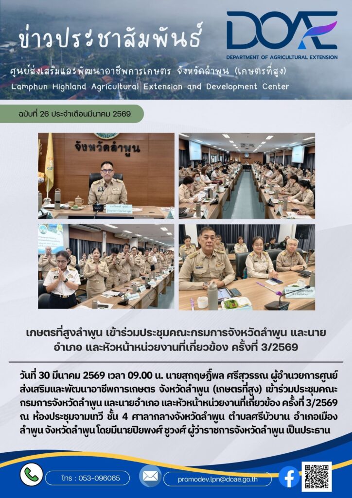 ข่าวประชาสัมพันธ์เกษตรที่สูงลำพูน เข้าร่วมประชุมคณะกรมการจังหวัดลำพูน และนายอำเภอ และหัวหน้าหน่วยงานที่เกี่ยวข้อง ครั้งที่ 3/2569 haec05 / 30 มีนาคม 2026 วันที่ 30 มีนาคม 256