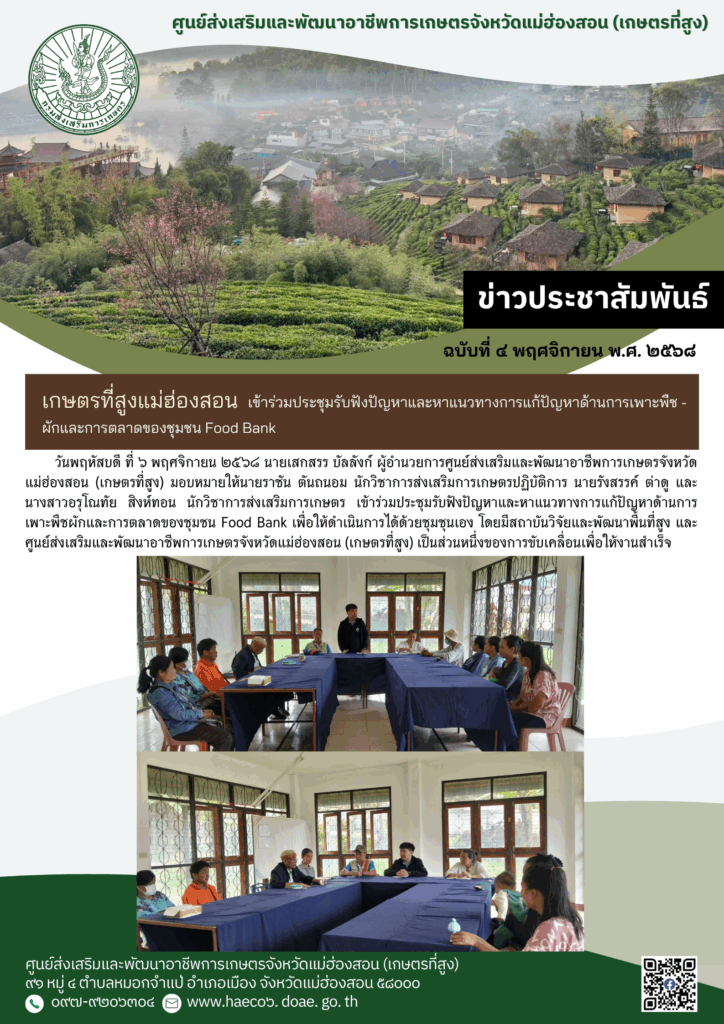 วันพฤหัสบดี ที่ ๖ พฤศจิกายน ๒๕๖๘ นายเสกสรร บัลลังก์ ผู้อำนวยการศูนย์ส่งเสริมและพัฒนาอาชีพการเกษตรจังหวัดแม่ฮ่องสอน (เกษตรที่สูง) มอบหมายให้นายราชัน ตันถนอม นักวิชาการส่งเสริมการเกษตรปฏิบัติการ นายรังสรรค์ ต่าดู และนางสาวอรุโณทัย สิงห์ทอน นักวิชาการส่งเสริมการเกษตร เข้าร่วมประชุมรับฟังปัญหาและหาแนวทางการแก้ปัญหาด้านการเพาะพืชผักและการตลาดของชุมชน Food Bank เพื่อให้ดำเนินการได้ด้วยชุมชุนเอง โดยมีสถาบันวิจัยและพัฒนาพื้นที่สูง และศูนย์ส่งเสริมและพัฒนาอาชีพการเกษตรจังหวัดแม่ฮ่องสอน (เกษตรที่สูง) เป็นส่วนหนึ่งของการขับเคลื่อนเพื่อให้งานสำเร็จ