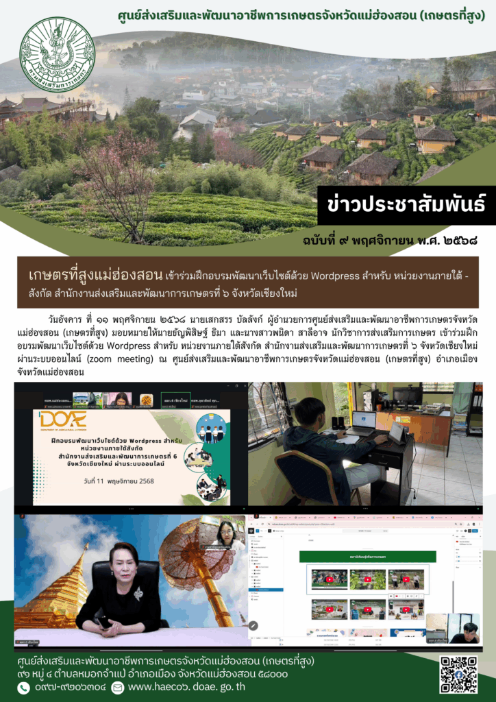 วันอังคาร ที่ ๑๑ พฤศจิกายน ๒๕๖๘ นายเสกสรร บัลลังก์ ผู้อำนวยการศูนย์ส่งเสริมและพัฒนาอาชีพการเกษตรจังหวัดแม่ฮ่องสอน (เกษตรที่สูง) มอบหมายให้นายธัญพิสิษฐ์ ธิมา และนางสาวพนิดา สาลีอาจ นักวิชาการส่งเสริมการเกษตร เข้าร่วมฝึกอบรมพัฒนาเว็บไซต์ด้วย WordPress สำหรับ หน่วยงานภายใต้สังกัด สำนักงานส่งเสริมและพัฒนาการเกษตรที่ ๖ จังหวัดเชียงใหม่ ผ่านระบบออนไลน์ (zoom meeting) ณ ศูนย์ส่งเสริมและพัฒนาอาชีพการเกษตร จังหวัดแม่ฮ่องสอน (เกษตรที่สูง) อำเภอเมือง จังหวัดแม่ฮ่องสอน