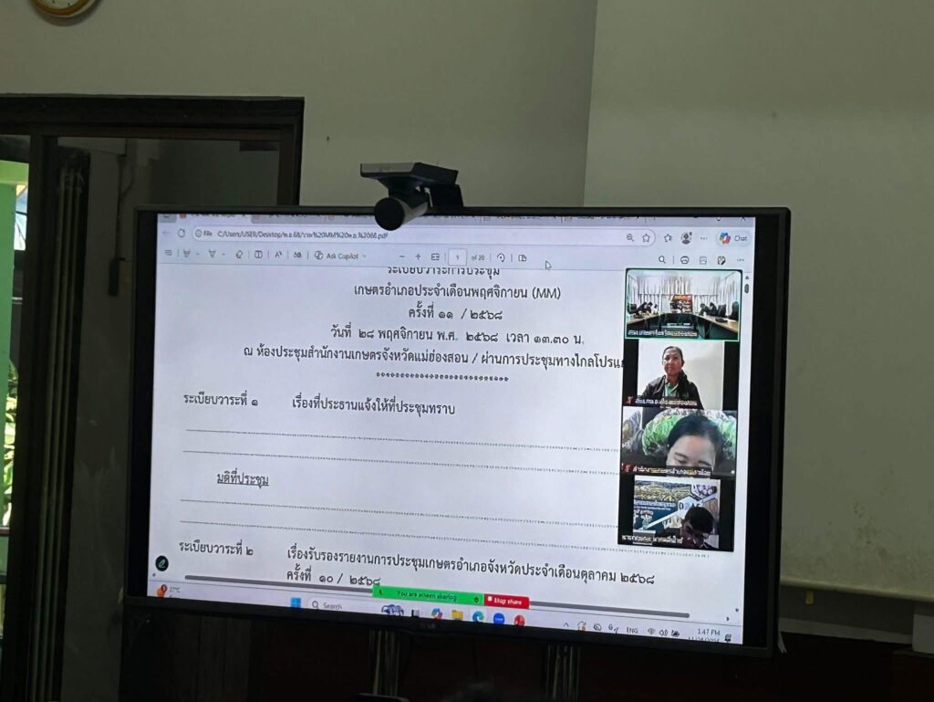 วันศุกร์ ที่ ๒๘ พฤศจิกายน ๒๕๖๘ นายเสกสรร บัลลังก์ ผู้อำนวยการศูนย์ส่งเสริมและพัฒนาอาชีพการเกษตรจังหวัดแม่ฮ่องสอน (เกษตรที่สูง) มอบหมายให้นางสาวทิพญ์สุคนธ์ แก้วกัญญา นักวิชาการส่งเสริมการเกษตรชำนาญการ เข้าร่วมประชุมเกษตรอำเภอประจำเดือนพฤศจิกายน (MM) ครั้งที่ ๑๑/๒๕๖๘ โดยมีนายนายพยุงศักดิ์ สิทธิลภ เกษตรจังหวัดแม่ฮ่องสอน เป็นประธานในการประชุมเกษตรอำเภอ ประจำเดือนพฤศจิกายน ๒๕๖๘ เพื่อติดตามผลการดำเนินงานตามนโยบายของกระทรวงเกษตรและสหกรณ์ สรุปผลการดำเนินงาน ติดตามการเบิกจ่าย วางแผนการดำเนินงาน สรุปประเด็นปัญหาระหว่างการดำเนินการ การติดตามสถานการณ์ภัยพิบัติ สถานการณ์การระบาดของศัตรูพืชและแนวทาการป้องกัน และความก้าวหน้าแม่ฮ่องสอนโมเดล ณ ห้องประชุมสำนักงานเกษตรจังหวัดแม่ฮ่องสอน อำเภอเมืองแม่ฮ่องสอน จังหวัดแม่ฮ่องสอน