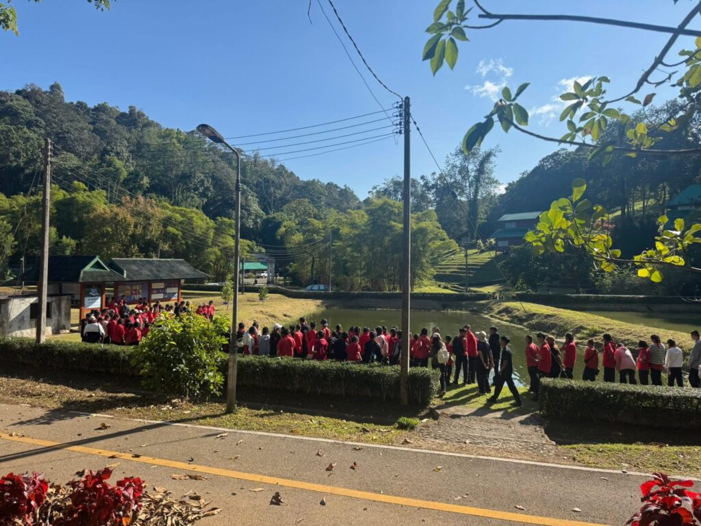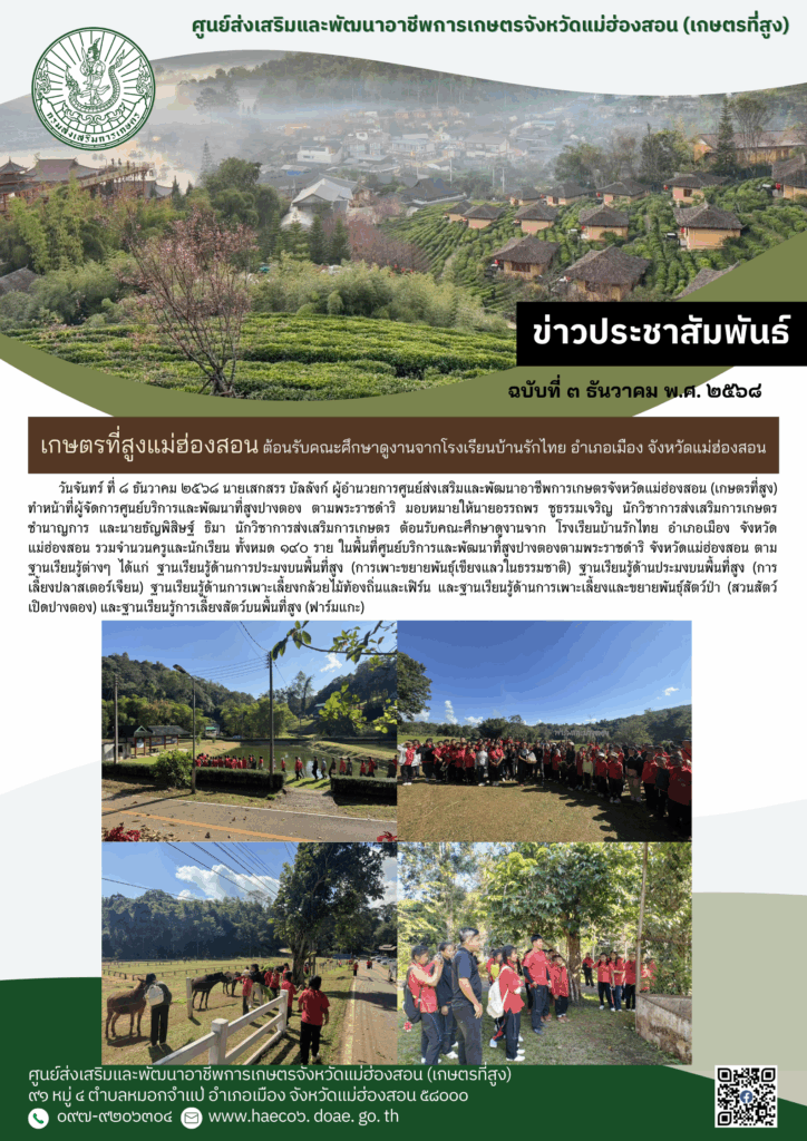 วันจันทร์ ที่ ๘ ธันวาคม ๒๕๖๘ นายเสกสรร บัลลังก์ ผู้อำนวยการศูนย์ส่งเสริมและพัฒนาอาชีพการเกษตรจังหวัดแม่ฮ่องสอน (เกษตรที่สูง) ทำหน้าที่ผู้จัดการศูนย์บริการและพัฒนาที่สูงปางตอง ตามพระราชดำริ มอบหมายให้นายอรรถพร ชูธรรมเจริญ นักวิชาการส่งเสริมการเกษตรชำนาญการ และนายธัญพิสิษฐ์ ธิมา นักวิชาการส่งเสริมการเกษตร ต้อนรับคณะศึกษาดูงานจาก โรงเรียนบ้านรักไทย อำเภอเมือง จังหวัดแม่ฮ่องสอน รวมจำนวนครูและนักเรียน ทั้งหมด ๑๙๐ ราย ในพื้นที่ศูนย์บริการและพัฒนาที่สูงปางตองตามพระราชดำริ จังหวัดแม่ฮ่องสอน ตามฐานเรียนรู้ต่างๆ ได้แก่ ฐานเรียนรู้ด้านการประมงบนพื้นที่สูง (การเพาะขยายพันธ์ุเขียงแลวในธรรมชาติ) ฐานเรียนรู้ด้านประมงบนพื้นที่สูง (การเลี้ยงปลาสเตอร์เจียน) ฐานเรียนรู้ด้านการเพาะเลี้ยงกล้วยไม้ท้องถิ่นและเฟิร์น และฐานเรียนรู้ด้านการเพาะเลี้ยงและขยายพันธุ์สัตว์ป่า (สวนสัตว์เปิดปางตอง) และฐานเรียนรู้การเลี้ยงสัตว์บนพื้นที่สูง (ฟาร์มแกะ)