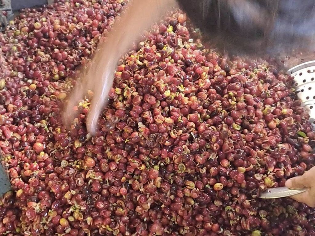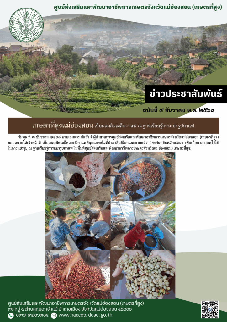 วันพุธ ที่ ๓ ธันวาคม ๒๕๖๘ นายเสกสรร บัลลังก์ ผู้อำนวยการศูนย์ส่งเสริมและพัฒนาอาชีพการเกษตรจังหวัดแม่ฮ่องสอน (เกษตรที่สูง) มอบหมายให้เจ้าหน้าที่ เก็บผลผลิตเมล็ดเชอร์รี่กาแฟที่สุกแดงเต็มที่นำมาสีเปลือกและตากแห้ง ป้องกันกลิ่นหมักและรา เพื่อเก็บสารกาแฟไว้ใช้ในการแปรรูป ณ ฐานเรียนรู้การแปรรูปกาแฟ ในพื้นที่ศูนย์ส่งเสริมและพัฒนาอาชีพการเกษตรจังหวัดแม่ฮ่องสอน (เกษตรที่สูง)