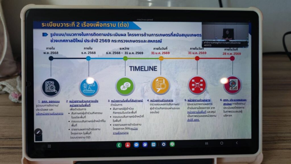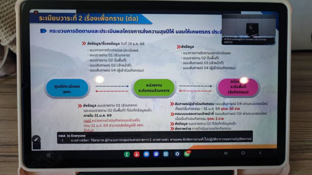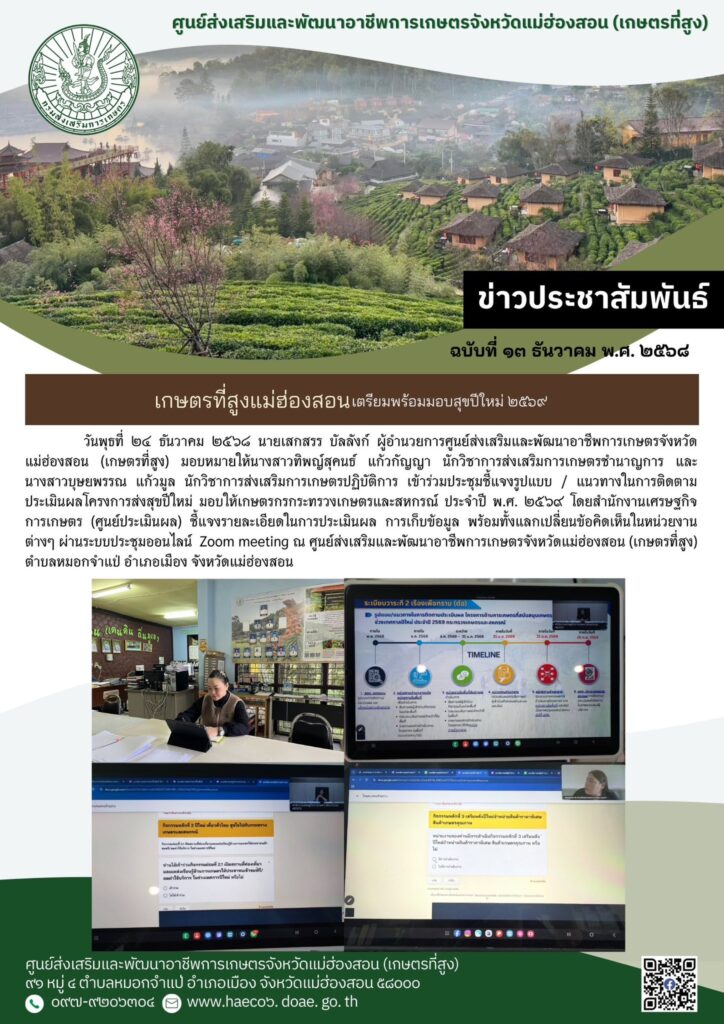 วันพุธที่ ๒๔ ธันวาคม ๒๕๖๘ นายเสกสรร บัลลังก์ ผู้อำนวยการศูนย์ส่งเสริมและพัฒนาอาชีพการเกษตรจังหวัดแม่ฮ่องสอน (เกษตรที่สูง) มอบหมายให้ นางสาวทิพญ์สุคนธ์ แก้วกัญญา นักวิชาการส่งเสริมการเกษตรชำนาญการ และนางสาวบุษยพรรณ แก้วมูล นักวิชาการส่งเสริมการเกษตรปฏิบัติการ เข้าร่วมประชุมชี้แจงรูปแบบ / แนวทางในการติดตามประเมินผลโครงการส่งสุขปีใหม่ มอบให้เกษตรกรกระทรวงเกษตรและสหกรณ์ ประจำปี พ.ศ. ๒๕๖๙ โดยสำนักงานเศรษฐกิจการเกษตร (ศูนย์ประเมินผล) ชี้แจงรายละเอียดในการประเมินผล การเก็บข้อมูล พร้อมทั้งแลกเปลี่ยนข้อคิดเห็นในหน่วยงานต่างๆ ผ่านระบบประชุมออนไลน์ Zoom meeting ณ ศูนย์ส่งเสริมและพัฒนาอาชีพการเกษตรจังหวัดแม่ฮ่องสอน (เกษตรที่สูง) ตำบลหมอกจำแป่ อำเภอเมือง จังหวัดแม่ฮ่องสอน
