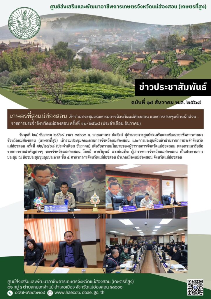 วันพุธที่ ๒๔ ธันวาคม ๒๕๖๘ เวลา ๐๙:๐๐ น. นายเสกสรร บัลลังก์ ผู้อำนวยการศูนย์ส่งเสริมและพัฒนาอาชีพการเกษตรจังหวัดแม่ฮ่องสอน (เกษตรที่สูง) เข้าร่วมประชุมคณะกรมการจังหวัดแม่ฮ่องสอน และการประชุมหัวหน้าส่วนราชการประจำจังหวัดแม่ฮ่องสอน ครั้งที่ ๑๒/๒๕๖๘ (ประจำเดือน ธันวาคม) เพื่อรับทราบนโยบายของผู้ว่าราชการจังหวัดแม่ฮ่องสอน ตลอดจนหารือข้อราชการงานสำคัญต่างๆ ของจังหวัดแม่ฮ่องสอน โดยมี นายวิบูรณ์ แววบัณฑิต ผู้ว่าราชการจังหวัดแม่ฮ่องสอน เป็นประธานการประชุม ณ ห้องประชุมขุนลุมประพาส ชั้น ๔ ศาลากลางจังหวัดแม่ฮ่องสอน อำเภอเมืองแม่ฮ่องสอน จังหวัดแม่ฮ่องสอน