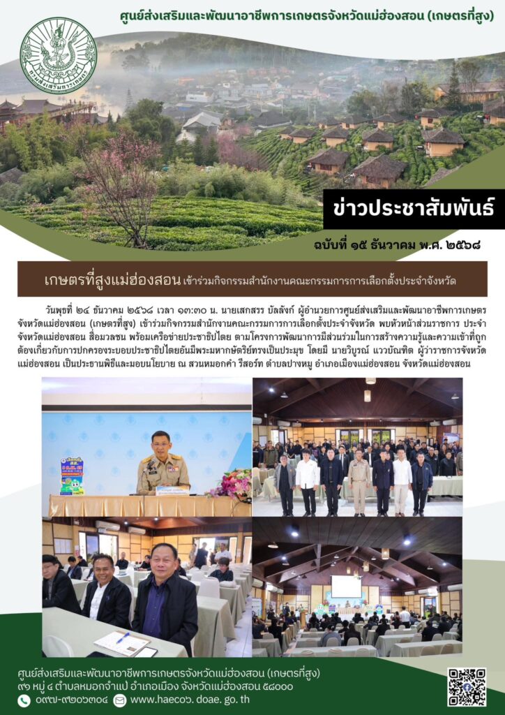 วันพุธที่ ๒๔ ธันวาคม ๒๕๖๘ เวลา ๑๓:๓๐ น. นายเสกสรร บัลลังก์ ผู้อำนวยการศูนย์ส่งเสริมและพัฒนาอาชีพการเกษตรจังหวัดแม่ฮ่องสอน (เกษตรที่สูง) เข้าร่วมกิจกรรมสำนักงานคณะกรรมการการเลือกตั้งประจำจังหวัด พบหัวหน้าส่วนราชการ ประจำจังหวัดแม่ฮ่องสอน สื่อมวลชน พร้อมเครือข่ายประชาธิปไตย ตามโครงการพัฒนาการมีส่วนร่วมในการสร้างความรู้และความเข้าที่ถูกต้องเกี่ยวกับการปกครองระบอบประชาธิปไตยอันมีพระมหากษัตริย์ทรงเป็นประมุข โดยมี นายวิบูรณ์ แววบัณฑิต ผู้ว่าราชการจังหวัดแม่ฮ่องสอน เป็นประธานพิธีและมอบนโยบาย ณ สวนหมอกคำ รีสอร์ท ตำบลปางหมู อำเภอเมืองแม่ฮ่องสอน จังหวัดแม่ฮ่องสอน