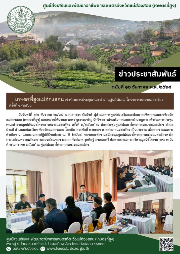วันจันทร์ที่ ๒๒ ธันวาคม ๒๕๖๘ นายเสกสรร บัลลังก์ ผู้อำนวยการศูนย์ส่งเสริมและพัฒนาอาชีพการเกษตรจังหวัดแม่ฮ่องสอน (เกษตรที่สูง) มอบหมายให้นายอรรถพร ชูธรรมเจริญ นักวิชาการส่งเสริมการเกษตรชำนาญการ เข้าร่วมการประชุมคณะทำงานศูนย์พัฒนาโครงการหลวงแม่สะเรียง ครั้งที่ ๑/๒๕๖๙ ณ ห้องประชุมศูนย์พัฒนาโครงการหลวงแม่สะเรียง ตำบลป่าแป๋ อำเภอแม่สะเรียง จังหวัดแม่ฮ่องสอน โดยมีนายวรศักดิ์ พานทอง นายอำเภอแม่สะเรียง เป็นประธาน เพื่อรายงานผลการดำเนินงาน และแผนการปฎิบัติปีงบประมาณ ปี ๒๕๖๙ ของคณะทำงานสนับสนุนศูนย์พัฒนาโครงการหลวงแม่สะเรียงหารือการเตรียมความพร้อมการตรวจเยี่ยมของ พลเอกกัมปนาท รุดดิษฐ์ องคมนตรี ประธานกรรมการบริหารมูลนิธิโครงการหลวง วันที่ ๗ มกราคม ๒๕๖๙ ณ ศูนย์พัฒนาโครงการหลวงแม่สะเรียง