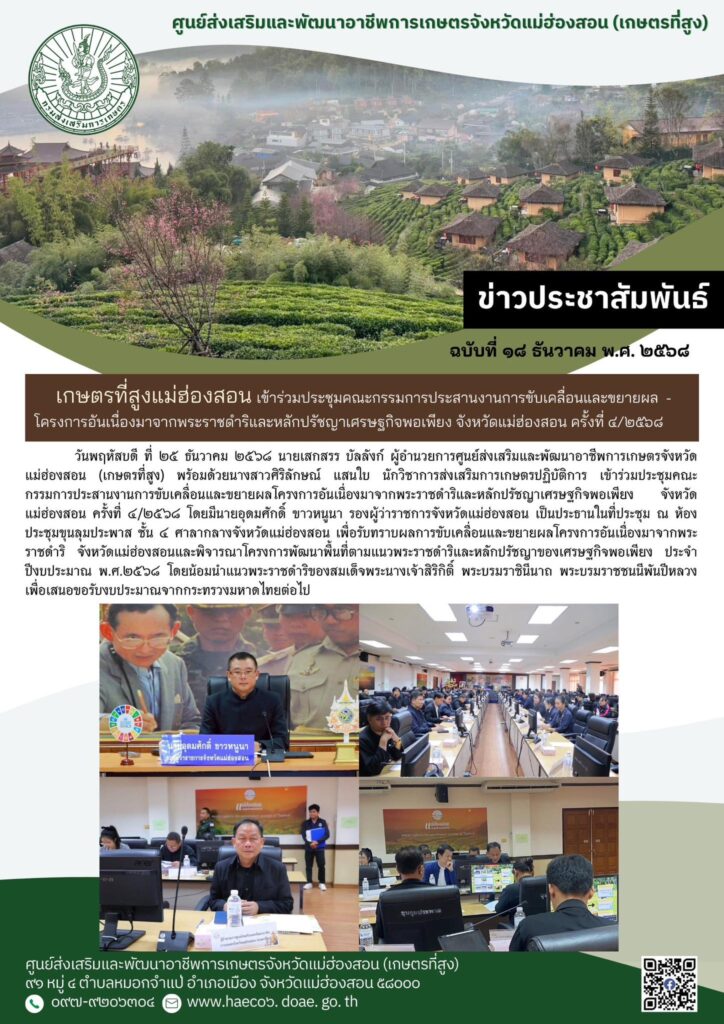 วันพฤหัสบดี ที่ ๒๕ ธันวาคม ๒๕๖๘ นายเสกสรร บัลลังก์ ผู้อำนวยการศูนย์ส่งเสริมและพัฒนาอาชีพการเกษตรจังหวัดแม่ฮ่องสอน (เกษตรที่สูง) พร้อมด้วยนางสาวศิริลักษณ์ แสนใบ นักวิชาการส่งเสริมการเกษตรปฏิบัติการ เข้าร่วมประชุมคณะกรรมการประสานงานการขับเคลื่อนและขยายผลโครงการอันเนื่องมาจากพระราชดำริและหลักปรัชญาเศรษฐกิจพอเพียง จังหวัดแม่ฮ่องสอน ครั้งที่ ๔/๒๕๖๘ โดยมีนายอุดมศักดิ์ ขาวหนูนา รองผู้ว่าราชการจังหวัดแม่ฮ่องสอน เป็นประธานในที่ประชุม ณ ห้องประชุมขุนลุมประพาส ชั้น ๔ ศาลากลางจังหวัดแม่ฮ่องสอน เพื่อรับทราบผลการขับเคลื่อนและขยายผลโครงการอันเนื่องมาจากพระราชดำริ จังหวัดแม่ฮ่องสอนและพิจารณาโครงการพัฒนาพื้นที่ตามแนวพระราชดำริและหลักปรัชญาของเศรษฐกิจพอเพียง ประจำปีงบประมาณ พ.ศ.๒๕๖๘ โดยน้อมนำแนวพระราชดำริของสมเด็จพระนางเจ้าสิริกิติ์ พระบรมราชินีนาถ พระบรมราชชนนีพันปีหลวง เพื่อเสนอขอรับงบประมาณจากกระทรวงมหาดไทยต่อไป