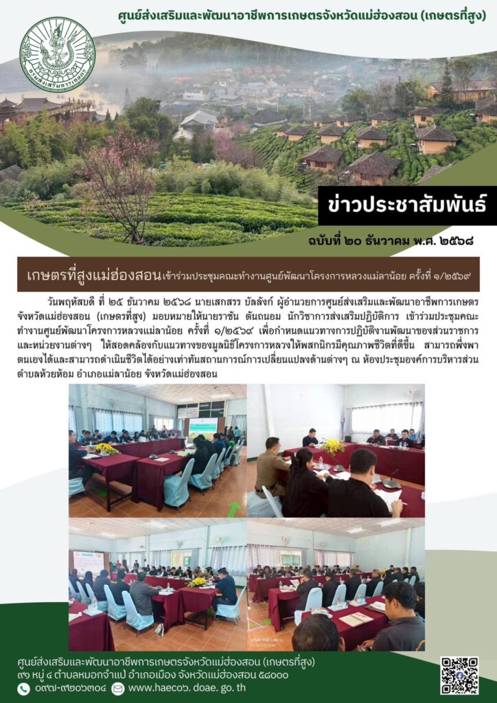 วันพฤหัสบดี ที่ ๒๕ ธันวาคม ๒๕๖๘ นายเสกสรร บัลลังก์ ผู้อำนวยการศูนย์ส่งเสริมและพัฒนาอาชีพการเกษตรจังหวัดแม่ฮ่องสอน (เกษตรที่สูง) มอบหมายให้นายราชัน ตันถนอม นักวิชาการส่งเสริมปฏิบัติการ เข้าร่วมประชุมคณะทำงานศูนย์พัฒนาโครงการหลวงแม่ลาน้อย ครั้งที่ ๑/๒๕๖๙ เพื่อกำหนดแนวทางการปฏิบัติงานพัฒนาของส่วนราชการและหน่วยงานต่างๆ ให้สอดคล้องกับแนวทางของมูลนิธิโครงการหลวงให้พสกนิกรมีคุณภาพชีวิตที่ดีขึ้น สามารถพึ่งพาตนเองได้และสามารถดำเนินชีวิตได้อย่างเท่าทันสถานการณ์การเปลี่ยนแปลงด้านต่างๆ ณ ห้องประชุมองค์การบริหารส่วนตำบลห้วยห้อม อำเภอแม่ลาน้อย จังหวัดแม่ฮ่องสอน