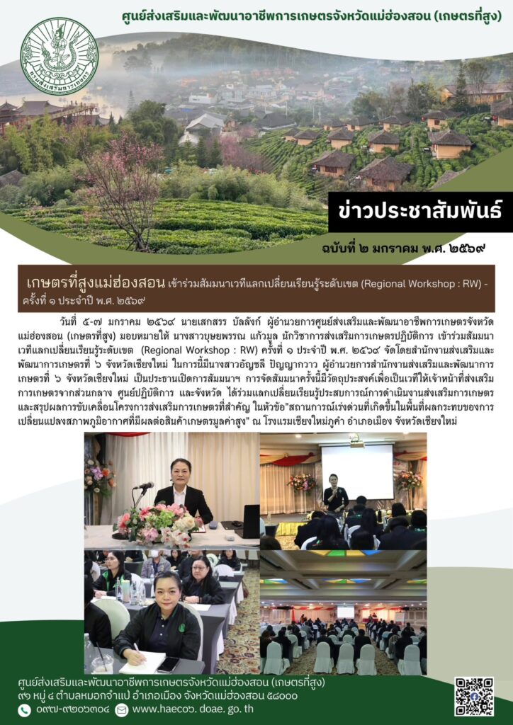 วันที่ ๕-๗ มกราคม ๒๕๖๙ นายเสกสรร บัลลังก์ ผู้อำนวยการศูนย์ส่งเสริมและพัฒนาอาชีพการเกษตรจังหวัดแม่ฮ่องสอน (เกษตรที่สูง) มอบหมายให้ นางสาวบุษยพรรณ แก้วมูล นักวิชาการส่งเสริมการเกษตรปฏิบัติการ เข้าร่วมสัมมนาเวทีแลกเปลี่ยนเรียนรู้ระดับเขต (Regional Workshop : RW) ครั้งที่ ๑ ประจำปี พ.ศ. ๒๕๖๙ จัดโดยสำนักงานส่งเสริมและพัฒนาการเกษตรที่ ๖ จังหวัดเชียงใหม่ ในการนี้มีนางสาวอัญชลี ปัญญากวาว ผู้อำนวยการสำนักงานส่งเสริมและพัฒนาการเกษตรที่ ๖ จังหวัดเชียงใหม่ เป็นประธานเปิดการสัมมนาฯ การจัดสัมมนาครั้งนี้มีวัตถุประสงค์เพื่อเป็นเวทีให้เจ้าหน้าที่ส่งเสริมการเกษตรจากส่วนกลาง ศูนย์ปฏิบัติการ และจังหวัด ได้ร่วมแลกเปลี่ยนเรียนรู้ประสบการณ์การดำเนินงานส่งเสริมการเกษตร และสรุปผลการขับเคลื่อนโครงการส่งเสริมการเกษตรที่สำคัญ ในหัวข้อ”สถานการณ์เร่งด่วนที่เกิดขึ้นในพื้นที่ผลกระทบของการเปลี่ยนแปลงสภาพภูมิอากาศที่มีผลต่อสินค้าเกษตรมูลค่าสูง” ณ โรงแรมเชียงใหม่ภูคำ อำเภอเมือง จังหวัดเชียงใหม่