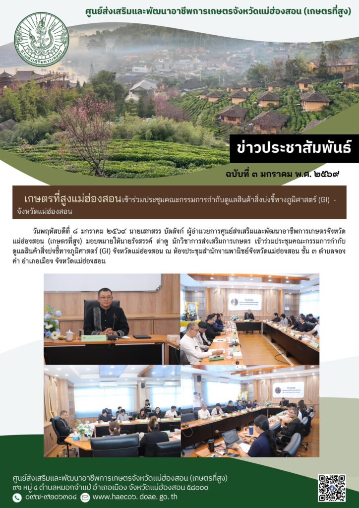 วันพฤหัสบดีที่ ๘ มกราคม ๒๕๖๙ นายเสกสรร บัลลังก์ ผู้อำนวยการศูนย์ส่งเสริมและพัฒนาอาชีพการเกษตรจังหวัดแม่ฮ่องสอน (เกษตรที่สูง) มอบหมายให้นายรังสรรค์ ต่าดู นักวิชาการส่งเสริมการเกษตร เข้าร่วมประชุมคณะกรรมการกำกับดูแลสินค้าสิ่งบ่งชี้ทางภูมิศาสตร์ (GI) จังหวัดแม่ฮ่องสอน ณ ห้องประชุมสำนักงานพานิชย์จังหวัดแม่ฮ่องสอน ชั้น ๓ ตำบลจองคำ อำเภอเมือง จังหวัดแม่ฮ่องสอน
